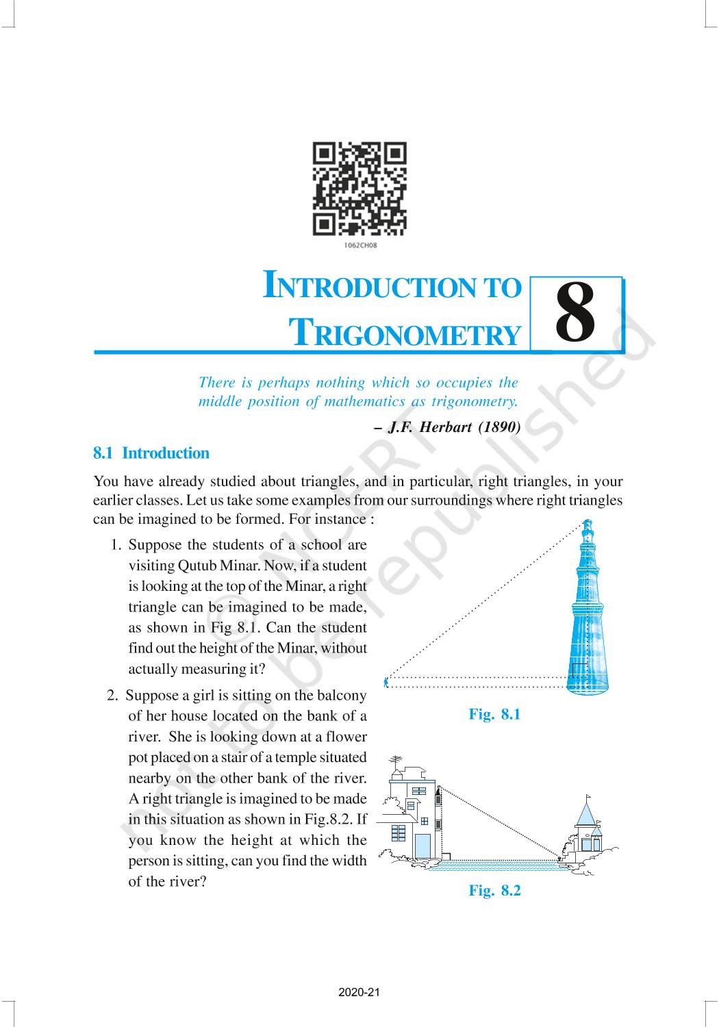 In this chapter, we will study some ratios of the sides of a right triangle with respect to its acute angles, called trigonometric ratios of the angle. Trigonometric Ratios of Some Specific Angles, Trigonometric Ratios of Complementary Angles, Trigonometric Identities are discussed in this chapter.