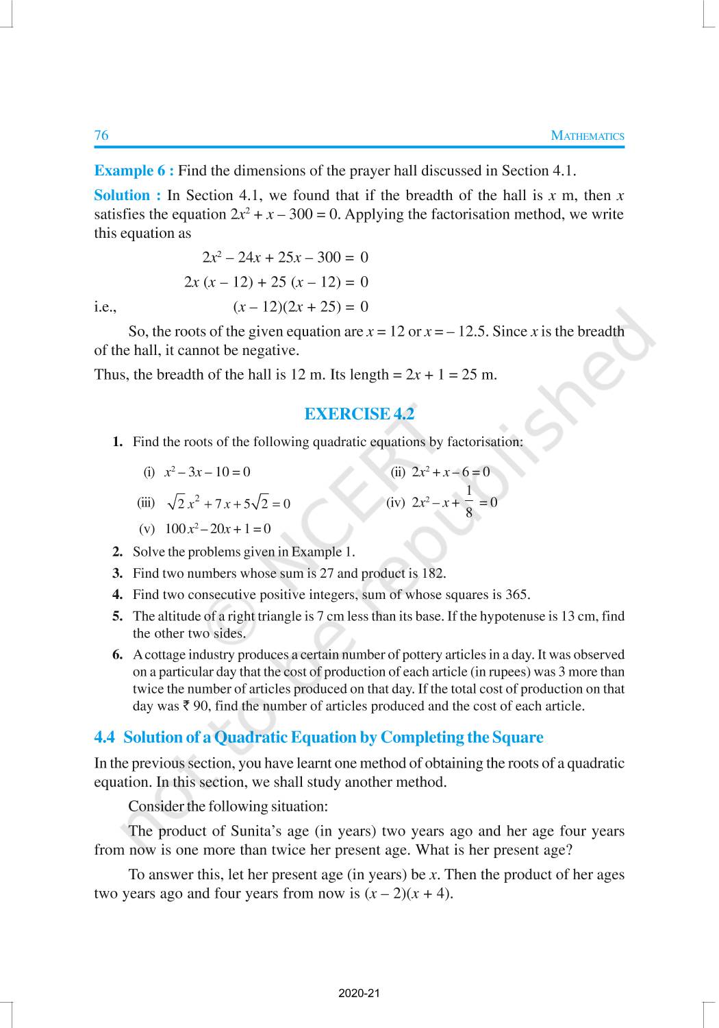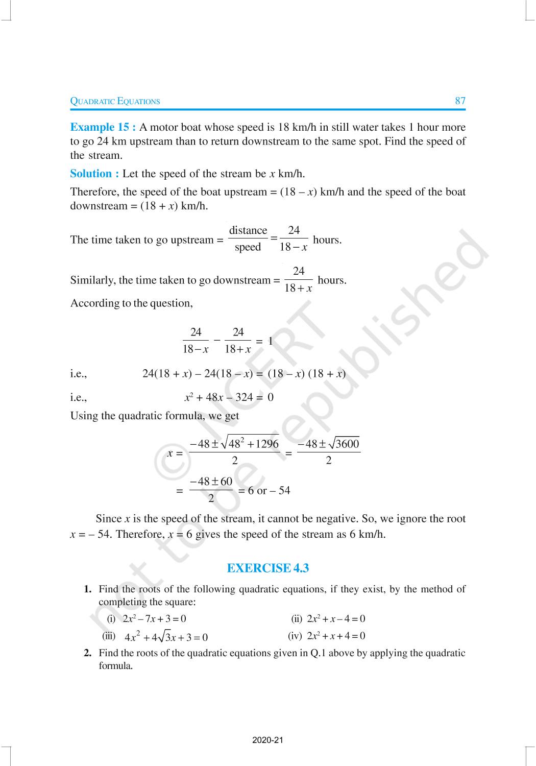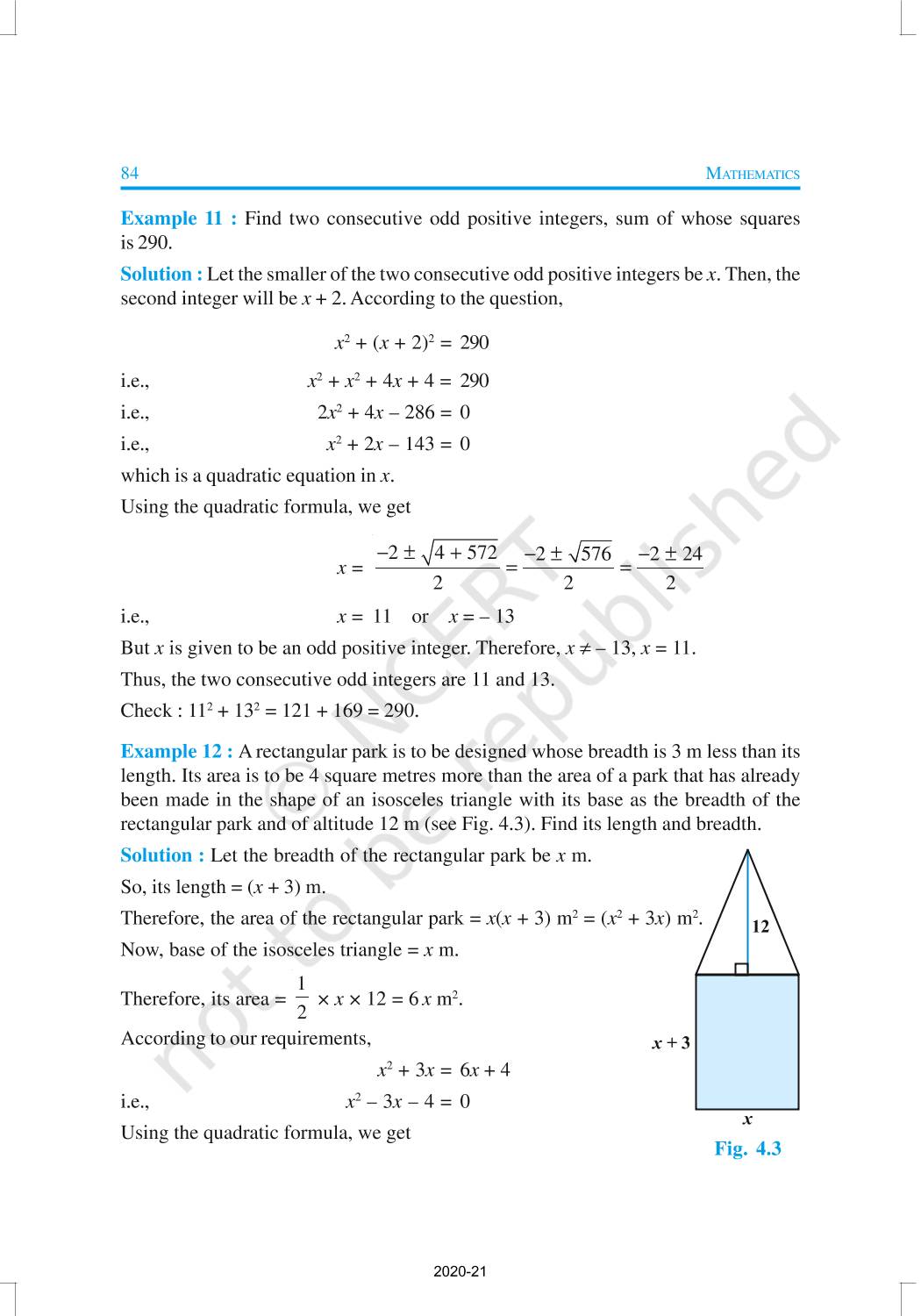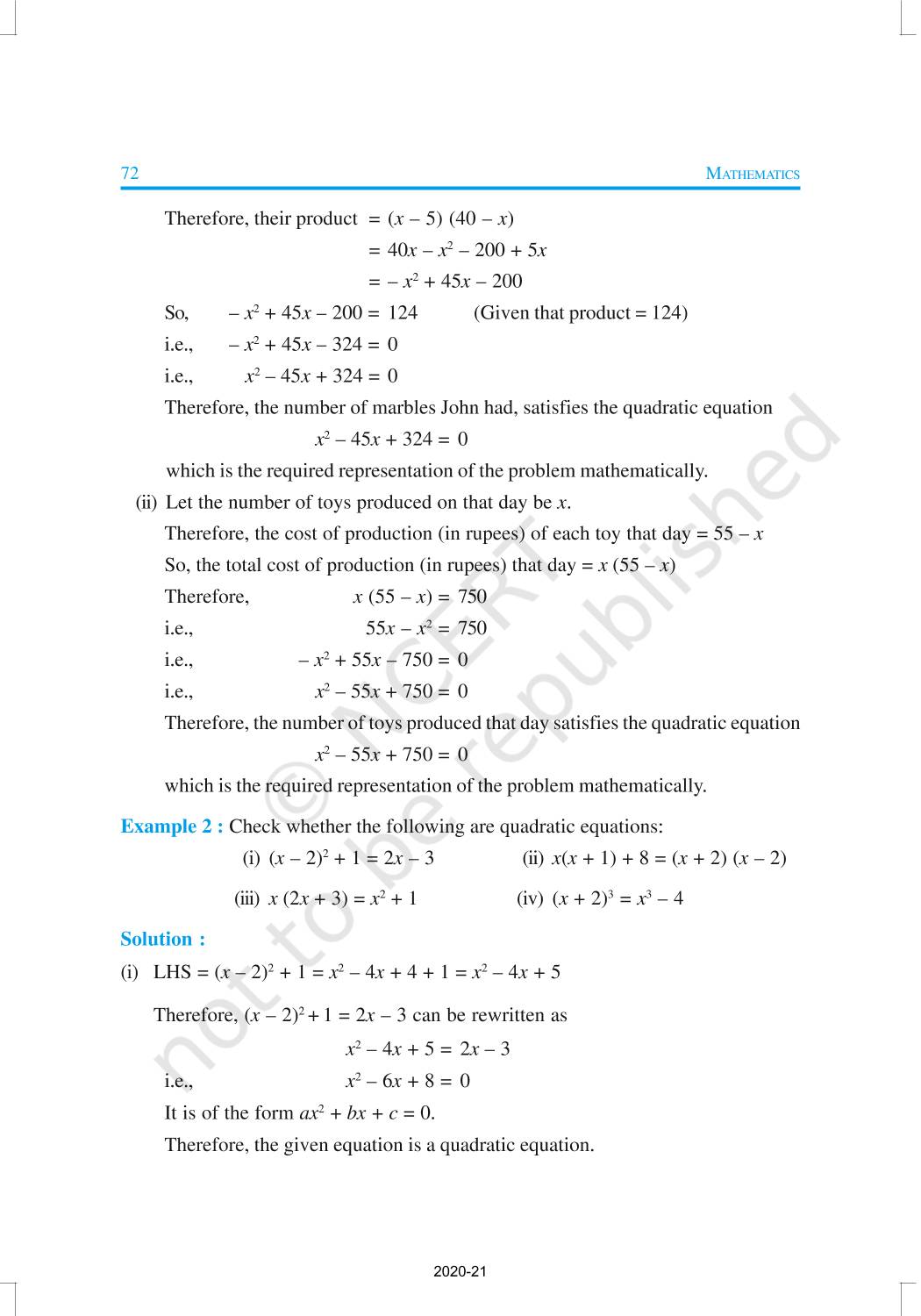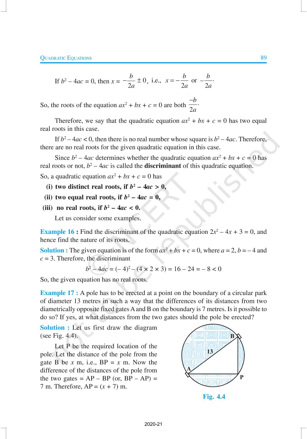 In this chapter, you will study quadratic equations, and various ways of finding their roots. You will also see some applications of quadratic equations in daily life situations. A quadratic equation in the variable x is an equation of the form ax2 + bx + c = 0, where a, b, c are real numbers, a ≠ 0. For example, 2x2 + x – 300 = 0 is a quadratic equation.