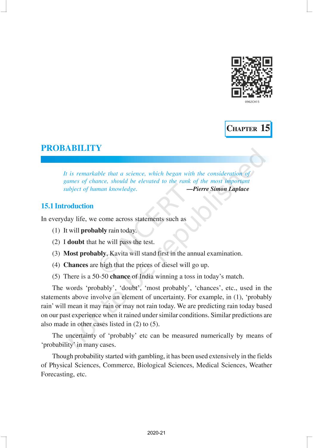 The words ‘probably’, ‘doubt’, ‘most probably’, ‘chances’, etc., used in the statements above involve an element of uncertainty. The uncertainty of ‘probably’ etc can be measured numerically by means of ‘probability’ in many cases. Though probability started with gambling, it has been used extensively in the fields of Physical Sciences, Commerce, Biological Sciences, Medical Sciences, Weather Forecasting, etc.