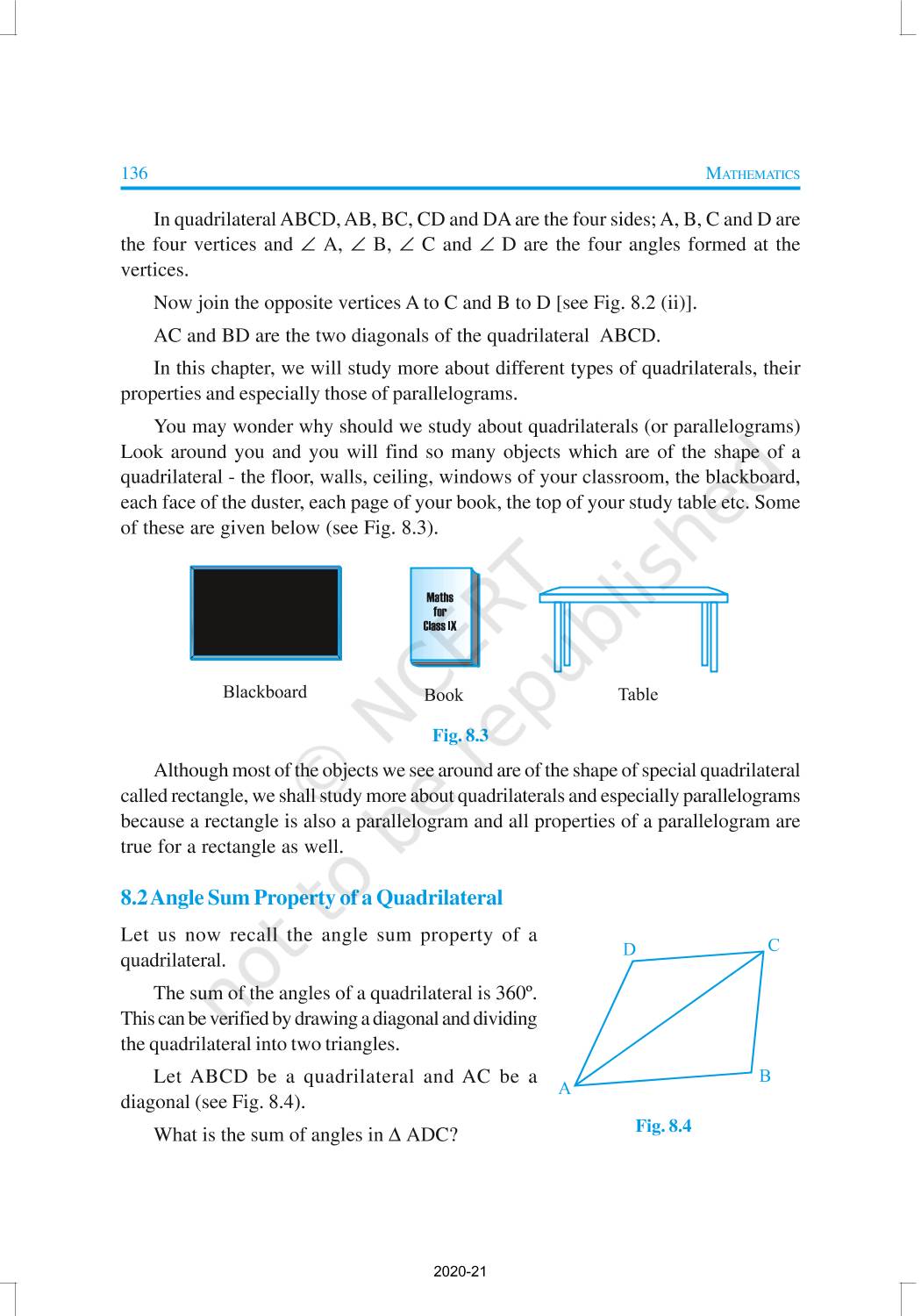 You may wonder why should we study about quadrilaterals (or parallelograms) Look around you and you will find so many objects which are of the shape of a quadrilateral - the floor, walls, ceiling, windows of your classroom, the blackboard, each face of the duster, each page of your book, the top of your study table etc.