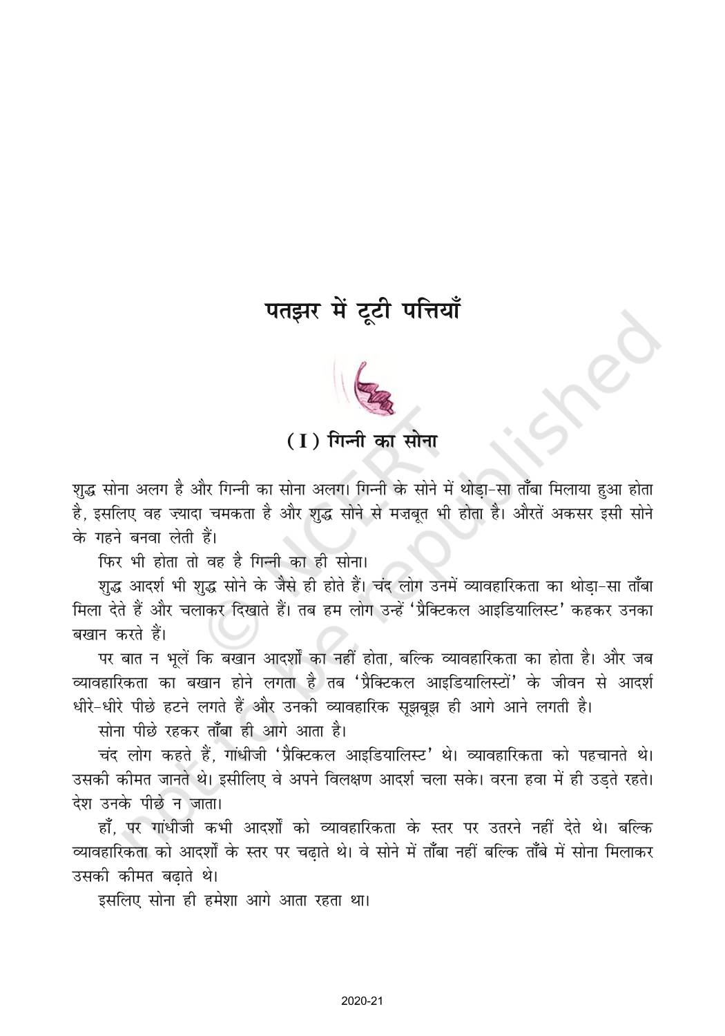 The time when students had limited options of choice for NCERT books wherein they need to go to the bookstore to buy the books but here at BeTrained.in, you can read the complete chapter-Ravindra Kelekar Patjhar Ki Tooti Pattiyan of NCERT books for class 10 Hindi Sparsh Part 2. If CBSE class 10 students are finding it hard to search for NCERT Hindi Sparsh Part 2 books online, then this is the right place as we have provided the textbooks of NCERT chapter wise. These books are available on our website for free along with NCERT Solutions and Exemplar solutions.