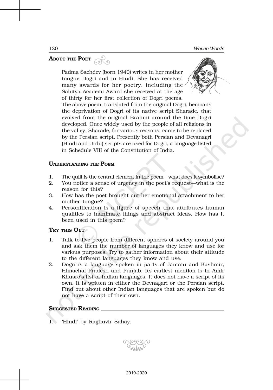 The time when students had limited options of choice for NCERT books wherein they need to go to the bookstore to buy the books but here at BeTrained.in, you can read the complete chapter-Poetry 6 Mother Tongue of NCERT books for class 11 English Woven Words. If CBSE class 11 students are finding it hard to search for NCERT English Woven Words books online, then this is the right place as we have provided the textbooks of NCERT chapter wise. These books are available on our website for free along with NCERT Solutions and Exemplar solutions.