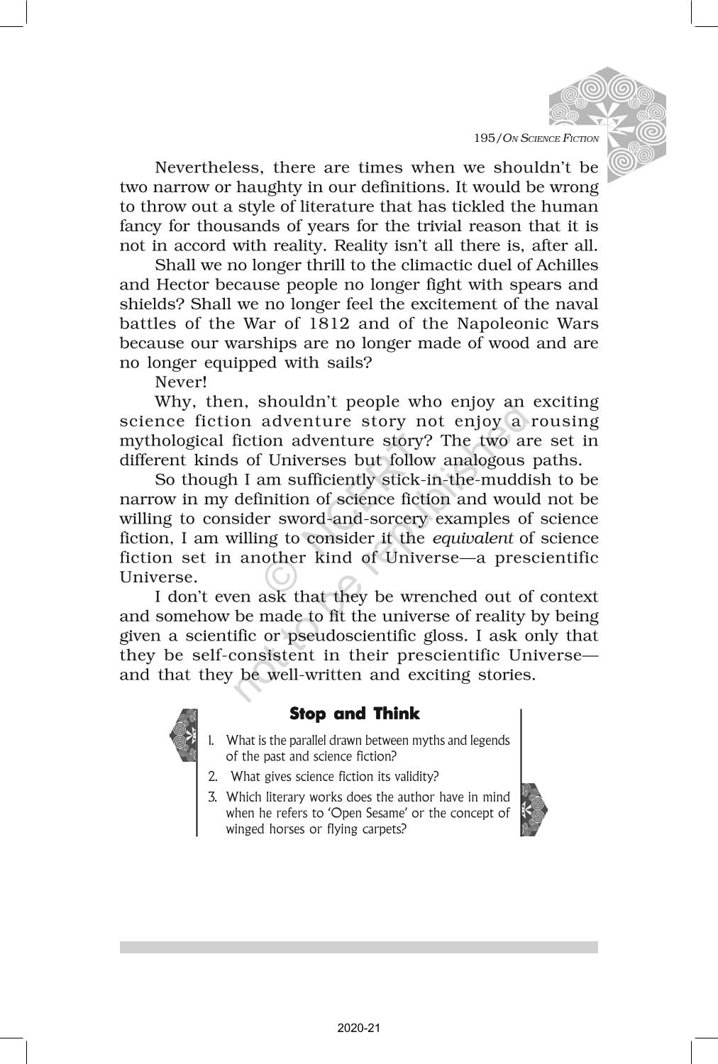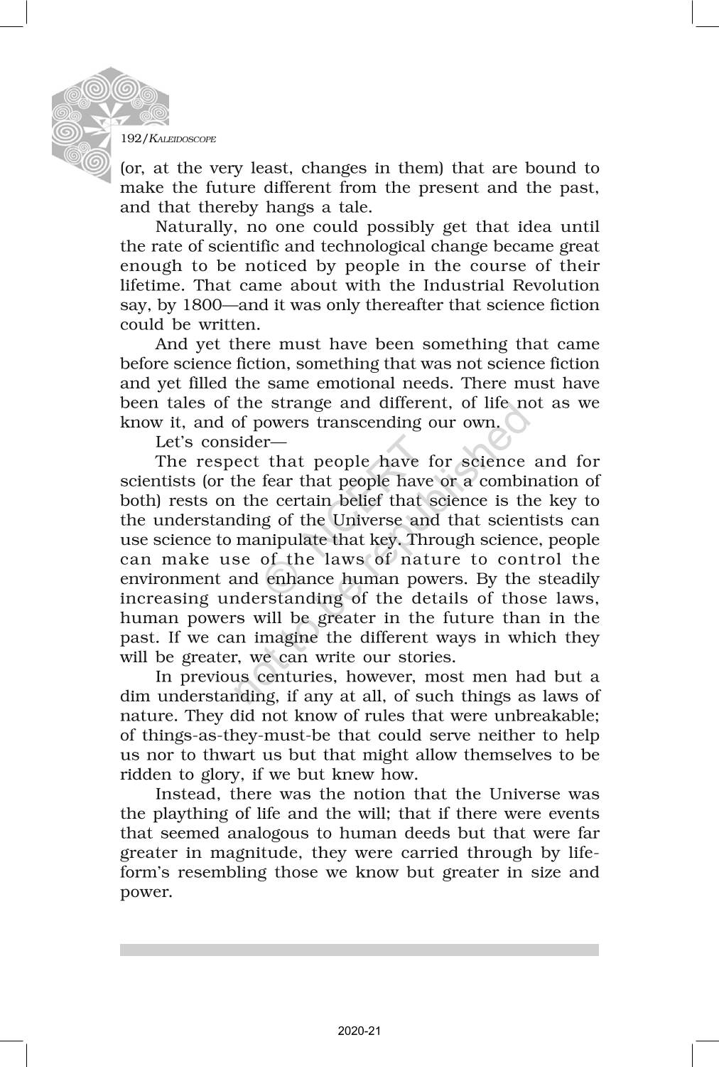 The time when students had limited options of choice for NCERT books wherein they need to go to the bookstore to buy the books but here at BeTrained.in, you can read the complete chapter-Non Fiction 6 On Science Fiction of NCERT books for class 12 Kaleidoscope. If CBSE class 12 students are finding it hard to search for NCERT Kaleidoscope books online, then this is the right place as we have provided the textbooks of NCERT chapter wise. These books are available on our website for free along with NCERT Solutions and Exemplar solutions.