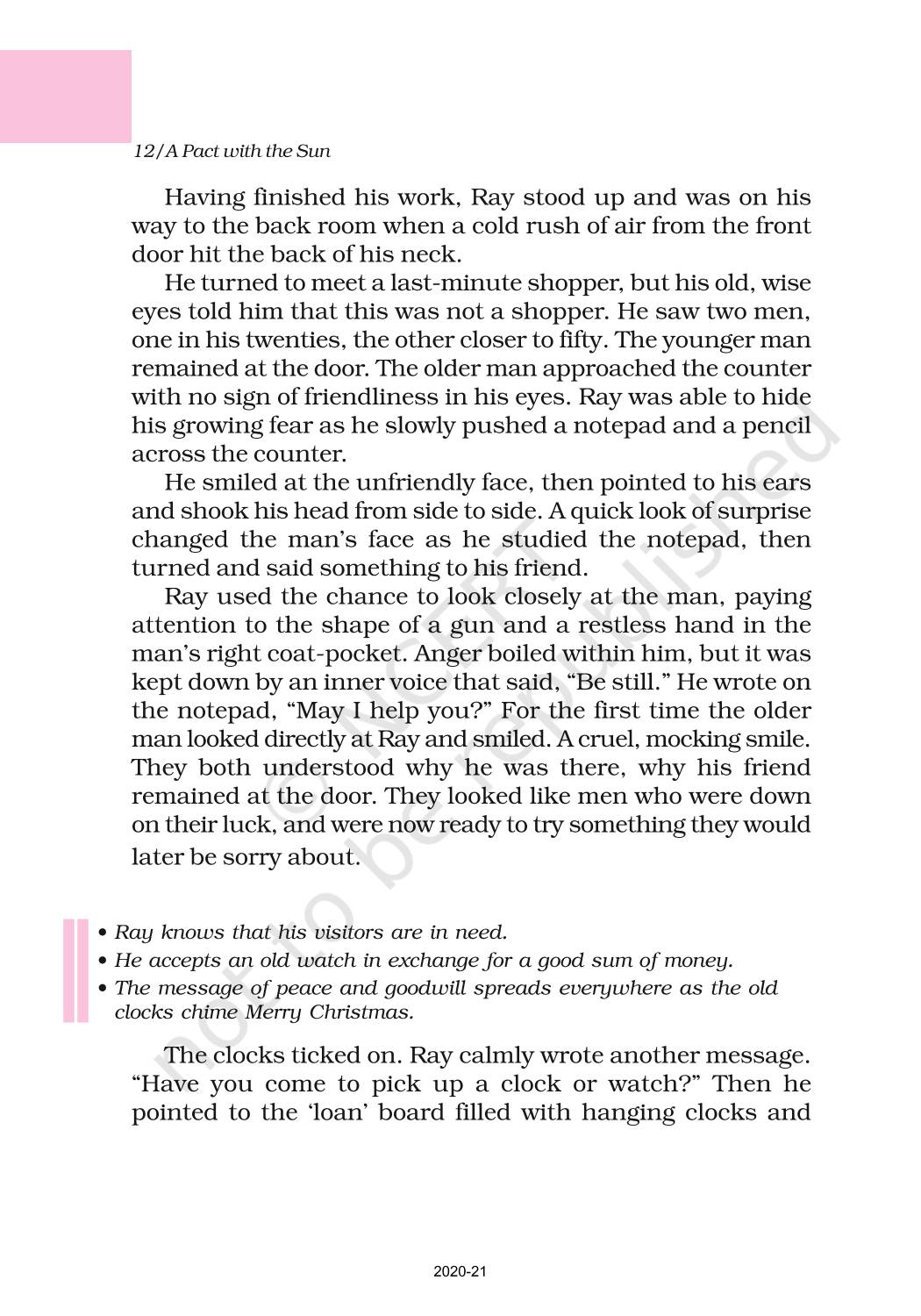 The time when students had limited options of choice for NCERT books wherein they need to go to the bookstore to buy the books but here at BeTrained.in, you can read the complete chapter-The Old Clock Shop of NCERT books for class 6 English A Pact With The Sun. If CBSE class 6 students are finding it hard to search for NCERT English A Pact With The Sun books online, then this is the right place as we have provided the textbooks of NCERT chapter wise. These books are available on our website for free along with NCERT Solutions and Exemplar solutions.
