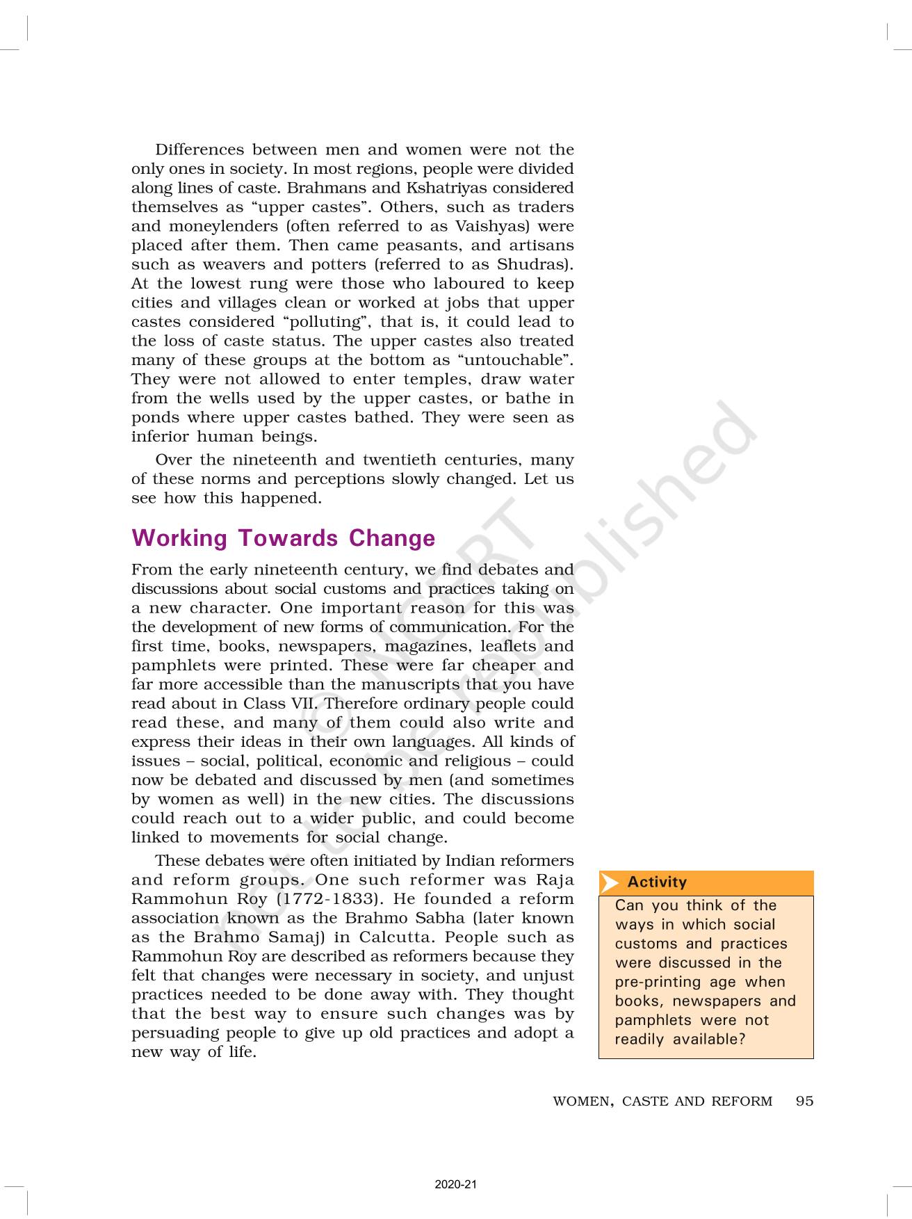 The time when students had limited options of choice for NCERT books wherein they need to go to the bookstore to buy the books but here at BeTrained.in, you can read the complete chapter-Women Caste And Reform of NCERT books for class 8 History Part II. If CBSE class 8 students are finding it hard to search for NCERT History Part II books online, then this is the right place as we have provided the textbooks of NCERT chapter wise. These books are available on our website for free along with NCERT Solutions and Exemplar solutions.