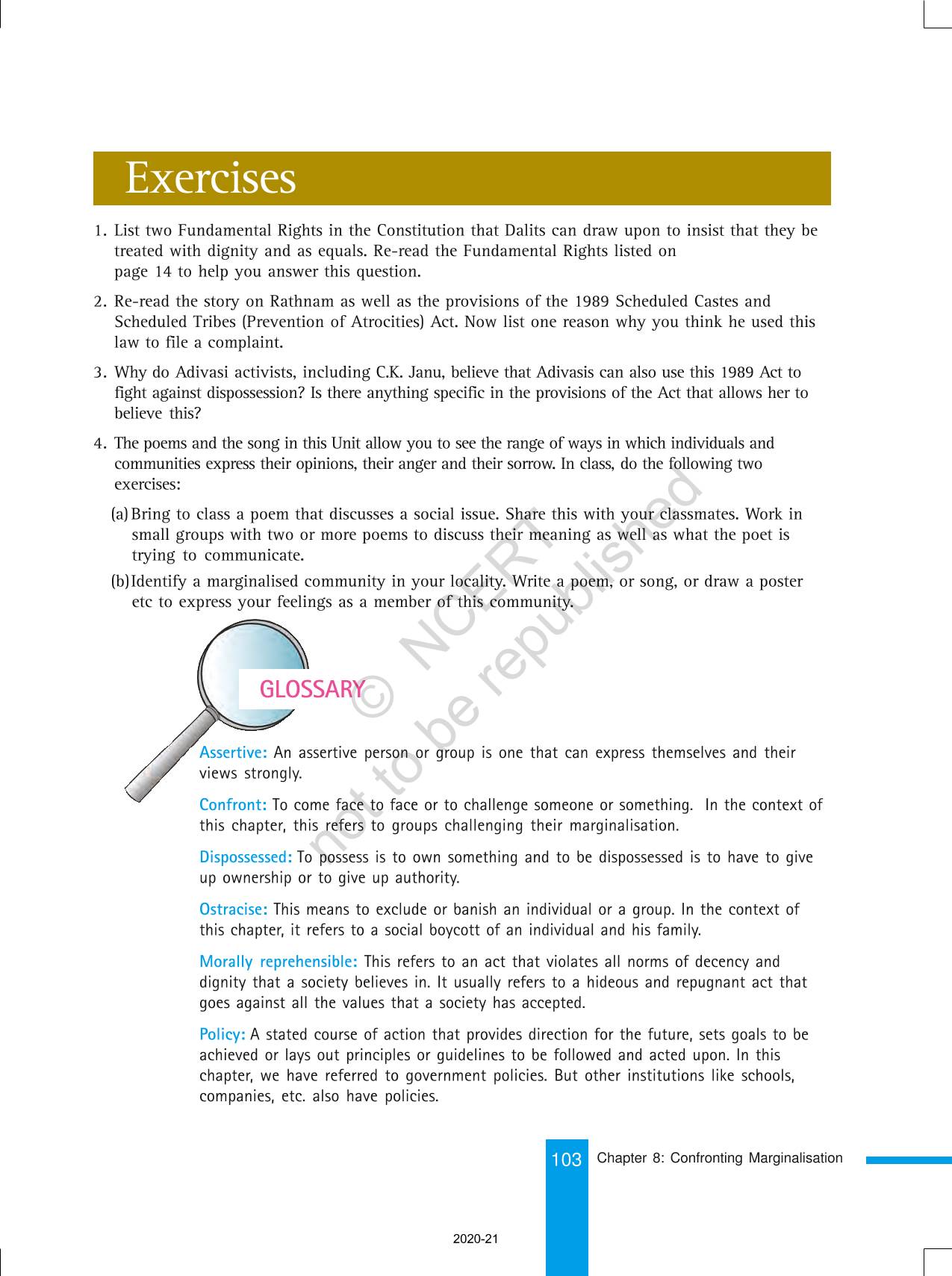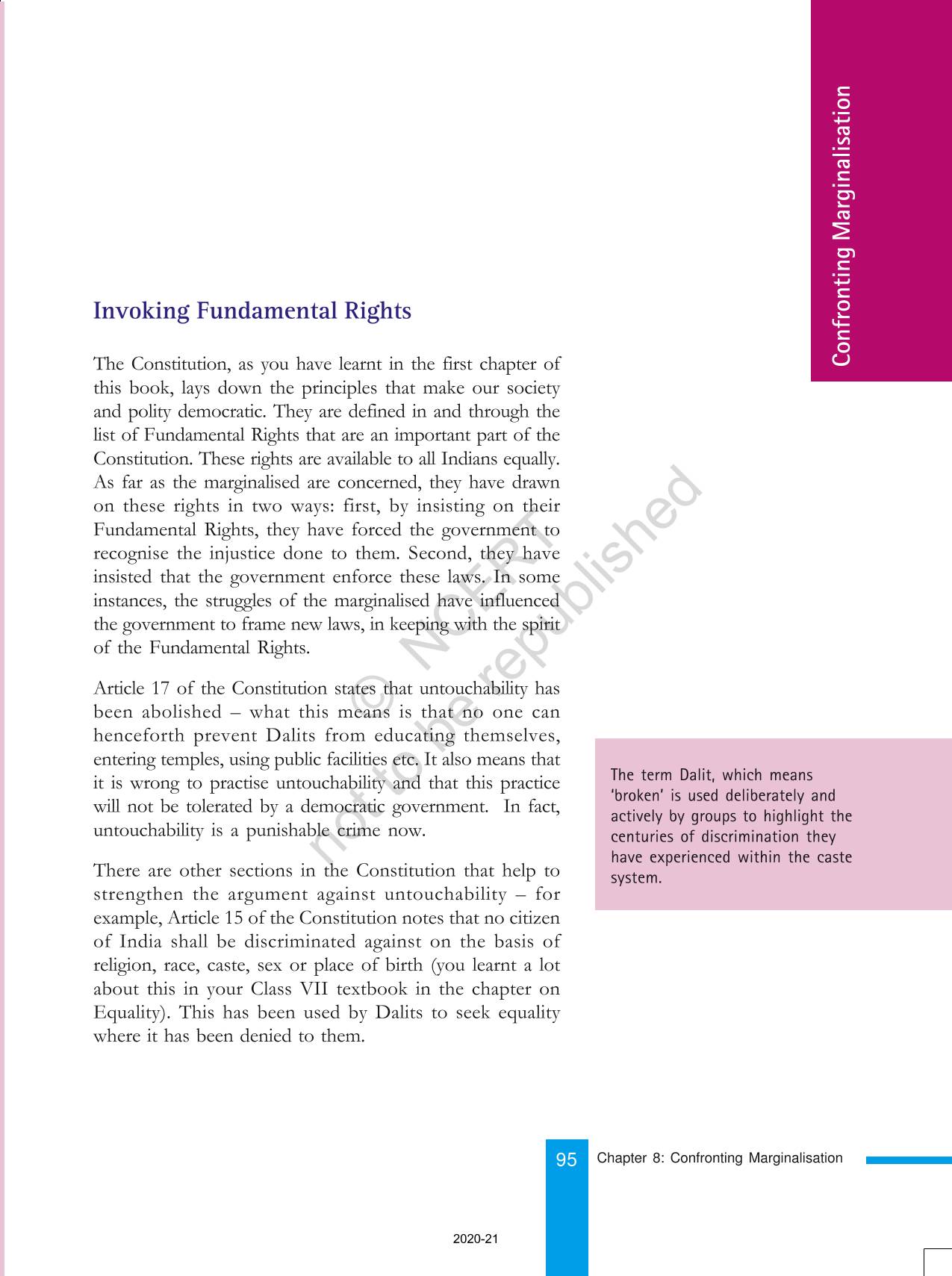 The time when students had limited options of choice for NCERT books wherein they need to go to the bookstore to buy the books but here at BeTrained.in, you can read the complete chapter-Confronting Marginalisaton of NCERT books for class 8 Social And Political Life III. If CBSE class 8 students are finding it hard to search for NCERT Social And Political Life III books online, then this is the right place as we have provided the textbooks of NCERT chapter wise. These books are available on our website for free along with NCERT Solutions and Exemplar solutions.