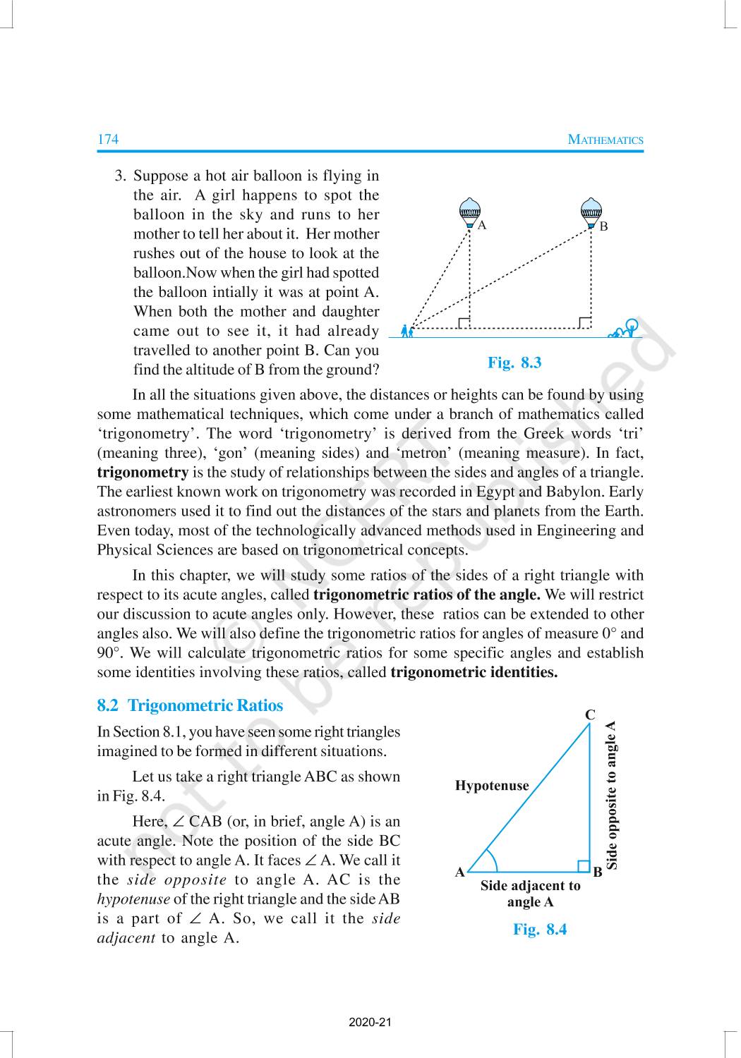 You have already studied about triangles, and in particular, right triangles, in your earlier classes. The distances or heights can be found by using some mathematical techniques, which come under a branch of mathematics called ‘trigonometry’. The word ‘trigonometry’ is derived from the Greek words ‘tri’ (meaning three), ‘gon’ (meaning sides) and ‘metron’ (meaning measure). In fact, trigonometry is the study of relationships between the sides and angles of a triangle.