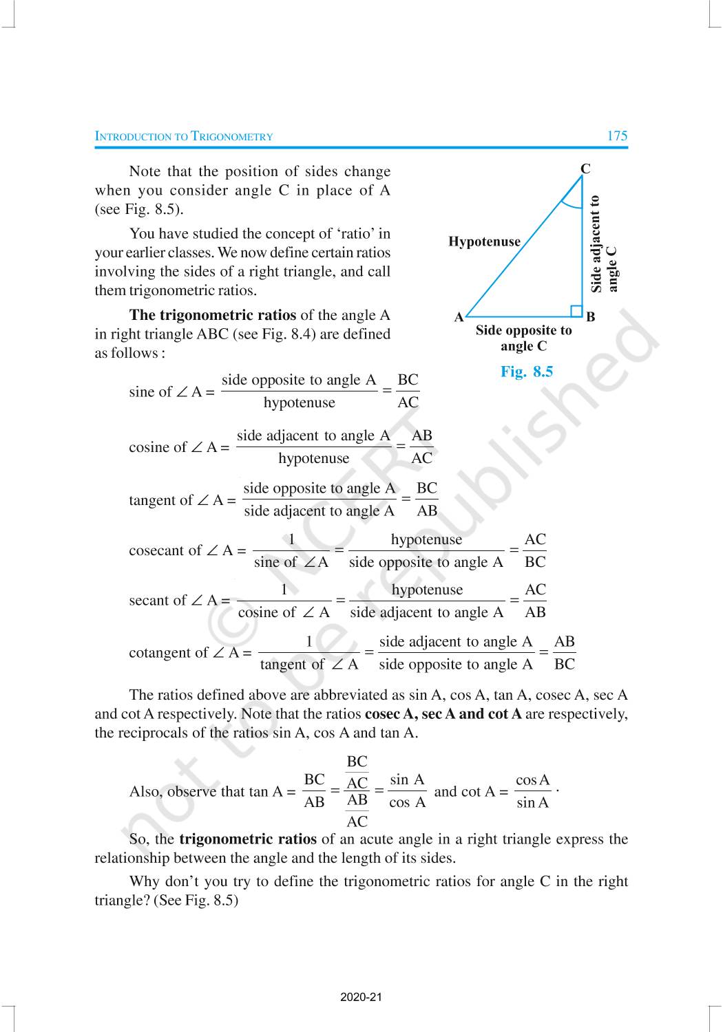 In this chapter, we will study some ratios of the sides of a right triangle with respect to its acute angles, called trigonometric ratios of the angle. Trigonometric Ratios of Some Specific Angles, Trigonometric Ratios of Complementary Angles, Trigonometric Identities are discussed in this chapter.