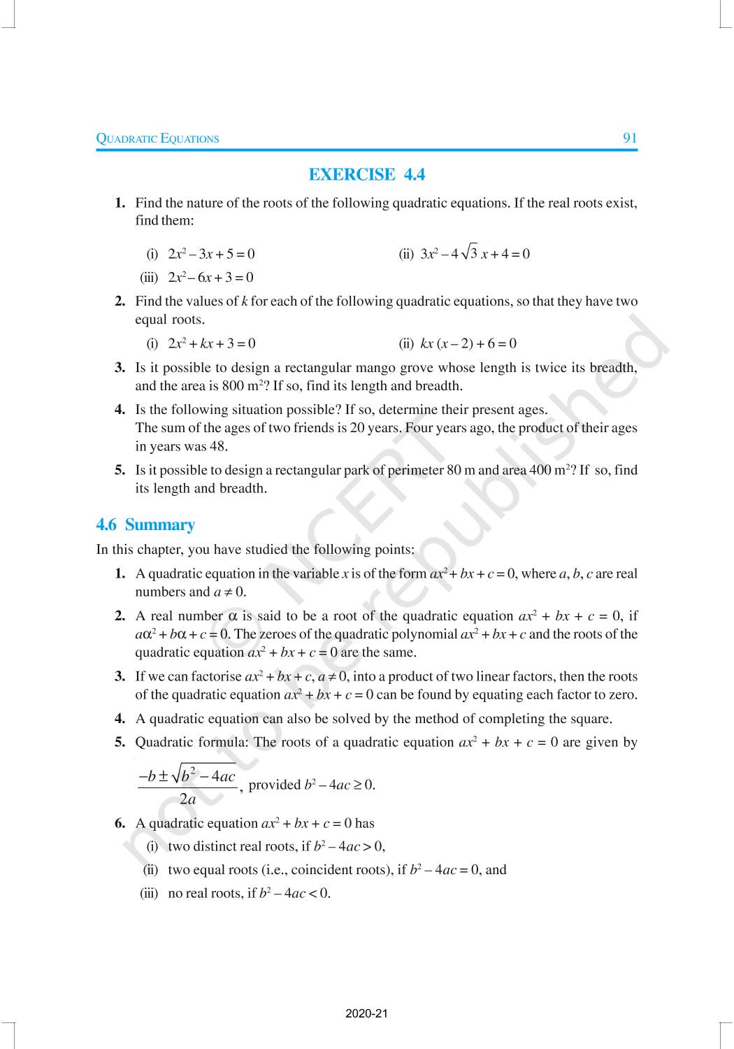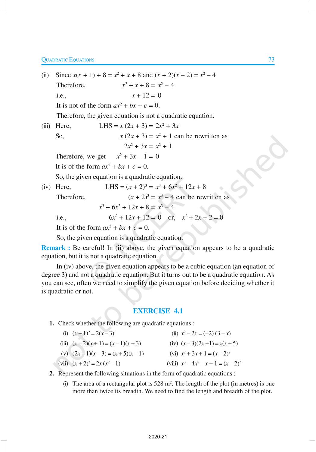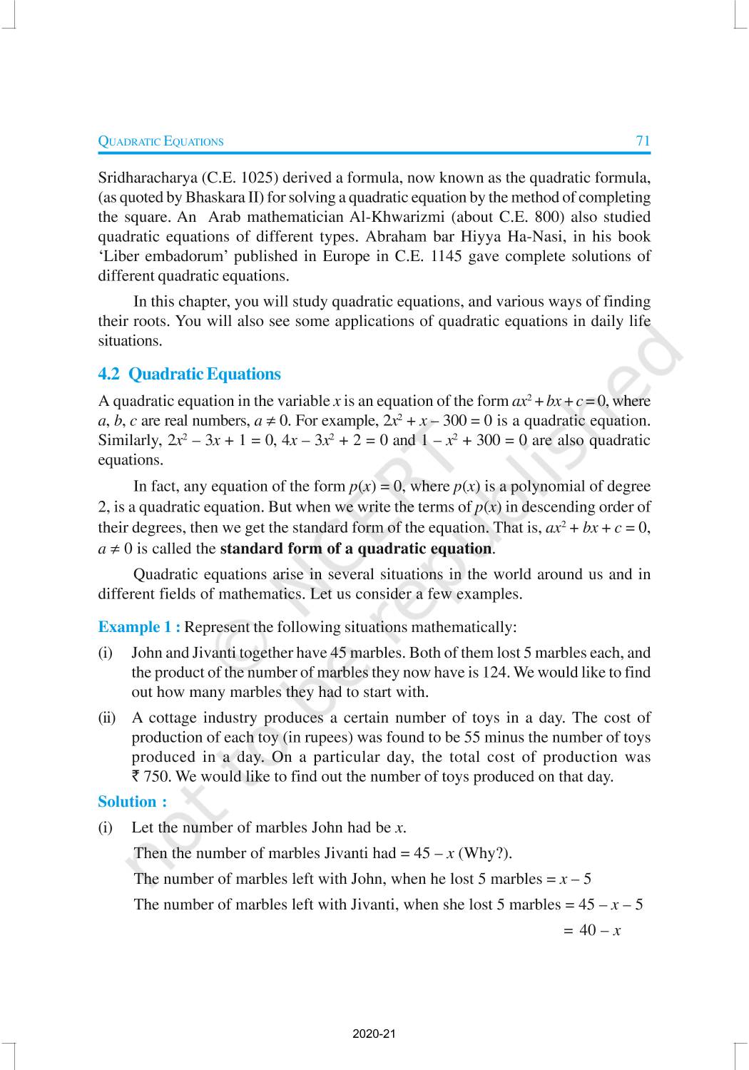 In this chapter, you will study quadratic equations, and various ways of finding their roots. You will also see some applications of quadratic equations in daily life situations. A quadratic equation in the variable x is an equation of the form ax2 + bx + c = 0, where a, b, c are real numbers, a ≠ 0. For example, 2x2 + x – 300 = 0 is a quadratic equation.