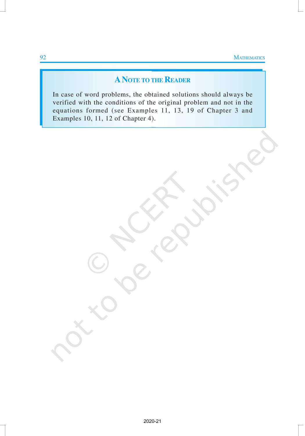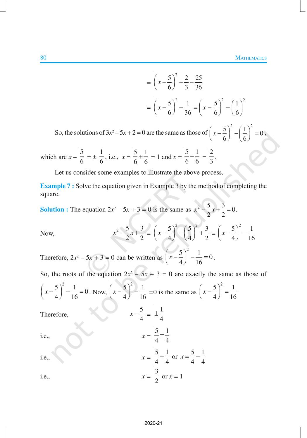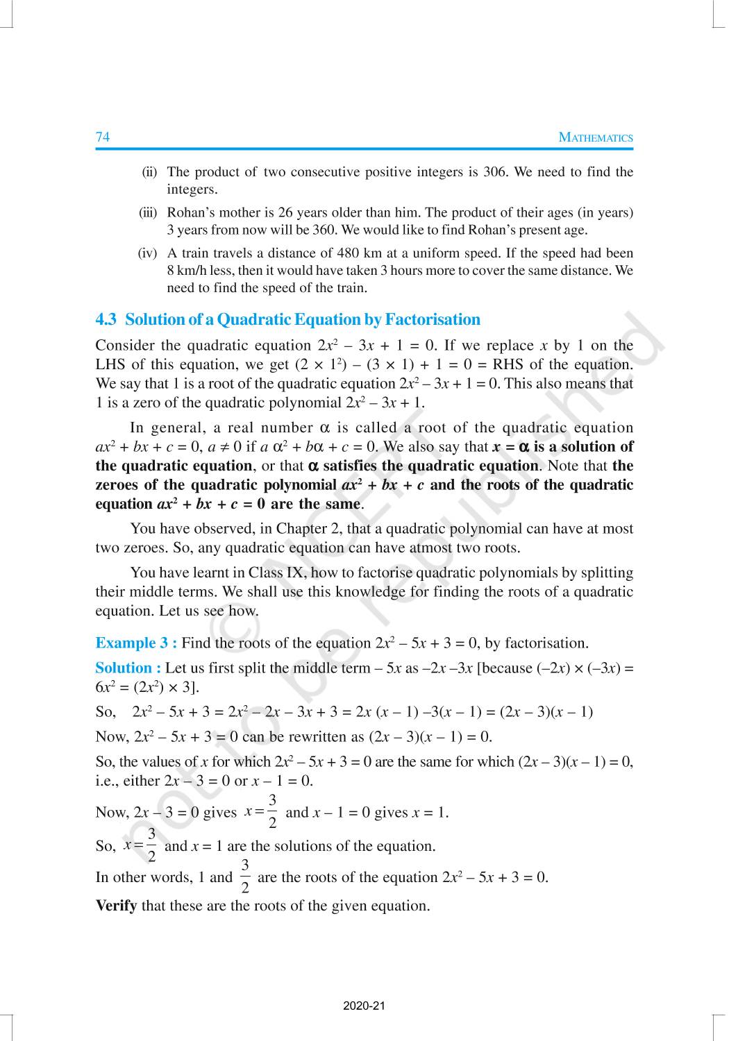 In this chapter, you will study quadratic equations, and various ways of finding their roots. You will also see some applications of quadratic equations in daily life situations. A quadratic equation in the variable x is an equation of the form ax2 + bx + c = 0, where a, b, c are real numbers, a ≠ 0. For example, 2x2 + x – 300 = 0 is a quadratic equation.