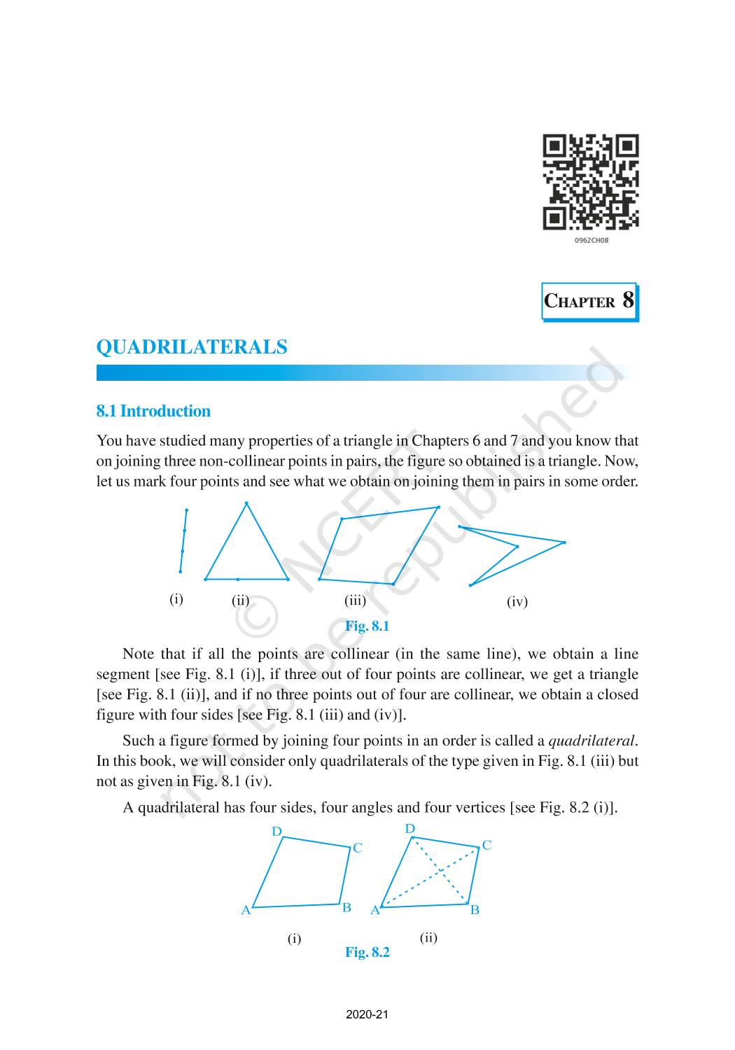 You have studied many properties of a triangle in Chapters 6 and 7 and you know that on joining three non-collinear points in pairs, the figure so obtained is a triangle. Now, let us mark four points and see what we obtain on joining them in pairs in some order.