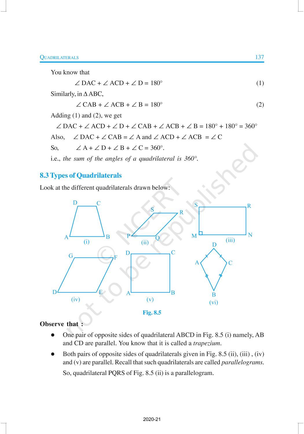 A quadrilateral has four sides, four angles and four vertices. In this chapter, we will study more about different types of quadrilaterals, their properties and especially those of parallelograms.