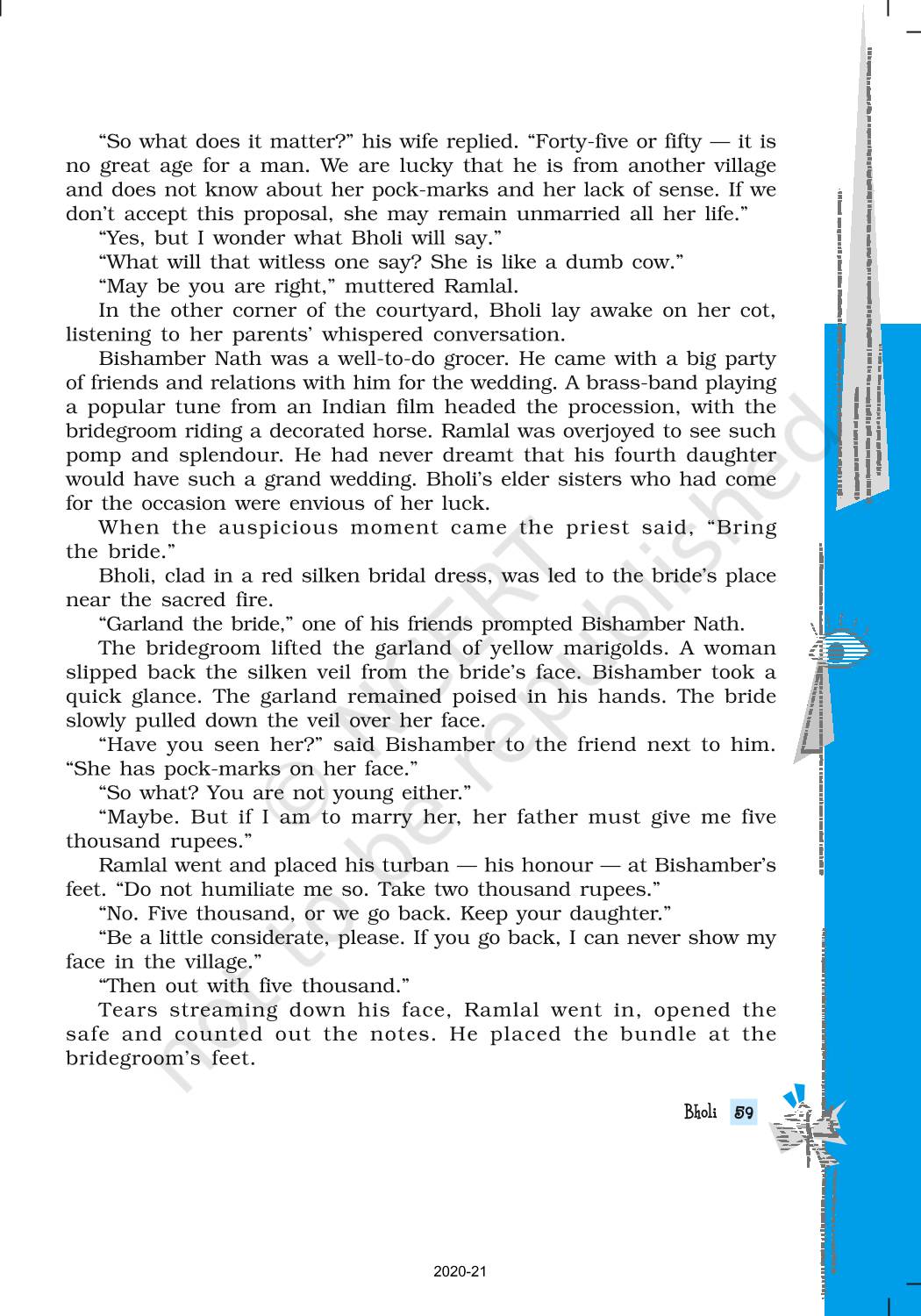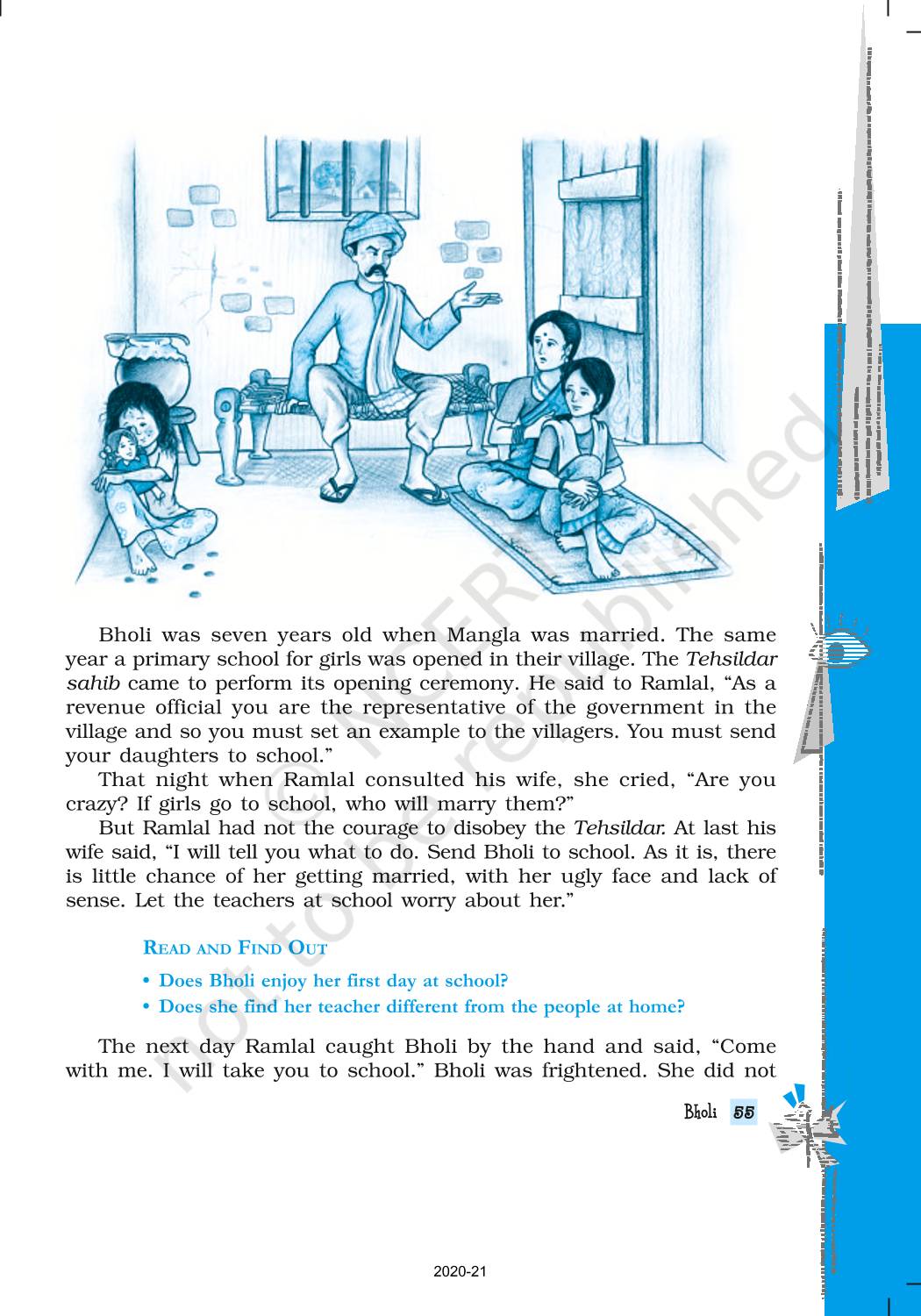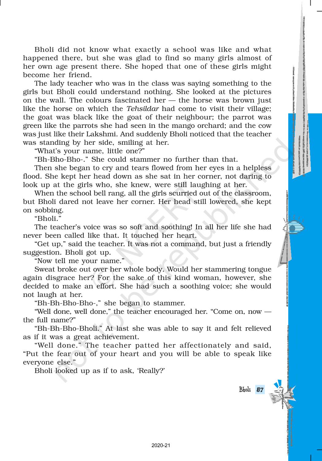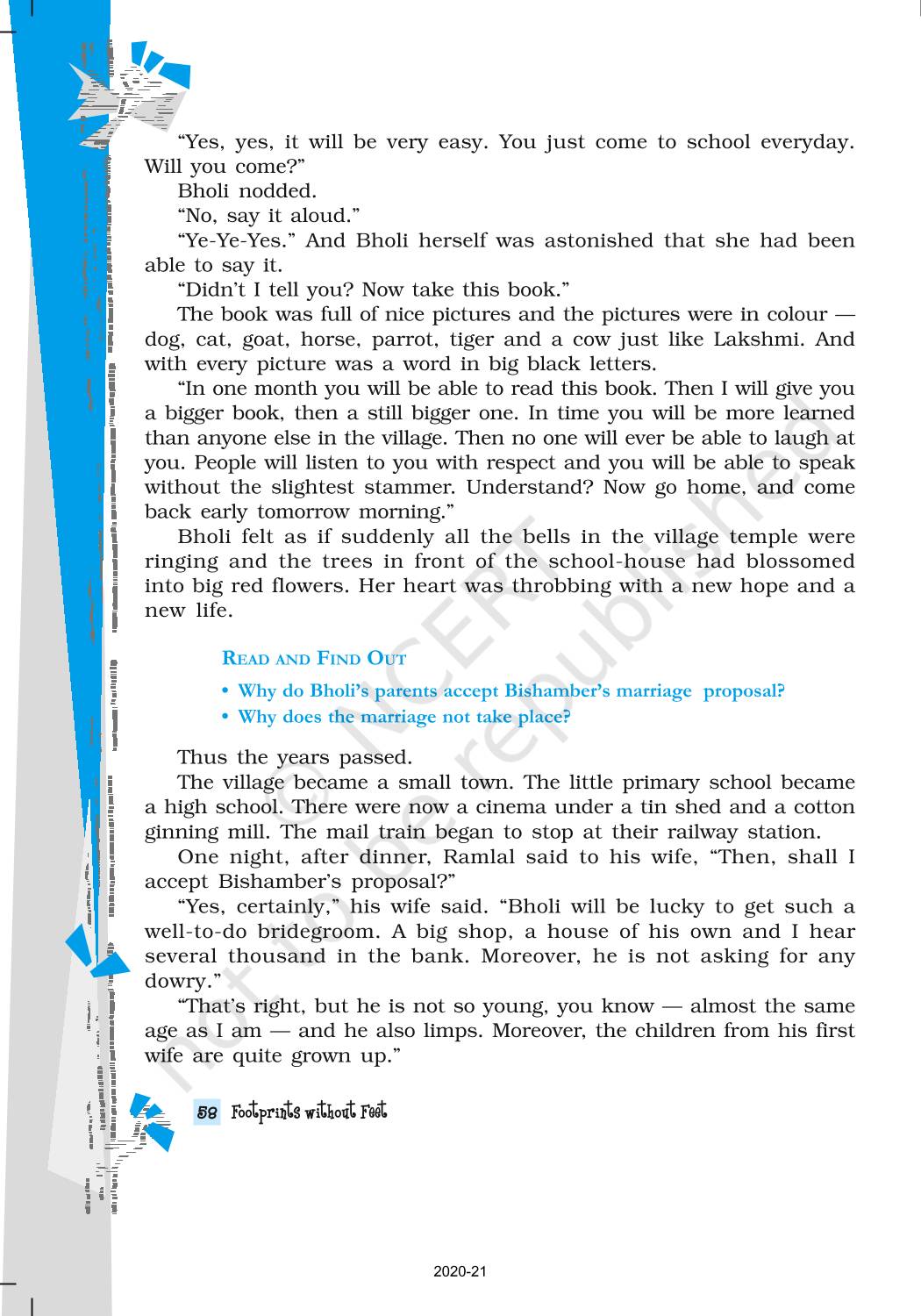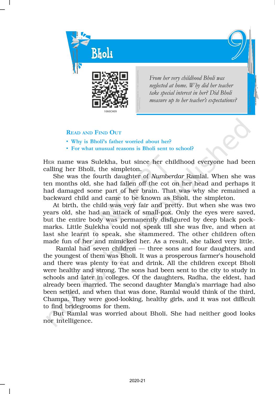 The time when students had limited options of choice for NCERT books wherein they need to go to the bookstore to buy the books but here at BeTrained.in, you can read the complete chapter-Bholi of NCERT books for class 10 Footprints Without Feet. If CBSE class 10 students are finding it hard to search for NCERT Footprints Without Feet books online, then this is the right place as we have provided the textbooks of NCERT chapter wise. These books are available on our website for free along with NCERT Solutions and Exemplar solutions.
