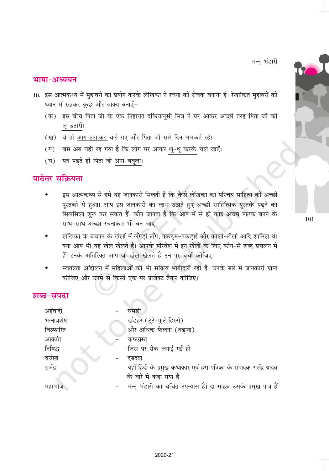 The time when students had limited options of choice for NCERT books wherein they need to go to the bookstore to buy the books but here at BeTrained.in, you can read the complete chapter-Mannu Bhandari of NCERT books for class 10 Hindi Kshitij Part 2. If CBSE class 10 students are finding it hard to search for NCERT Hindi Kshitij Part 2 books online, then this is the right place as we have provided the textbooks of NCERT chapter wise. These books are available on our website for free along with NCERT Solutions and Exemplar solutions.