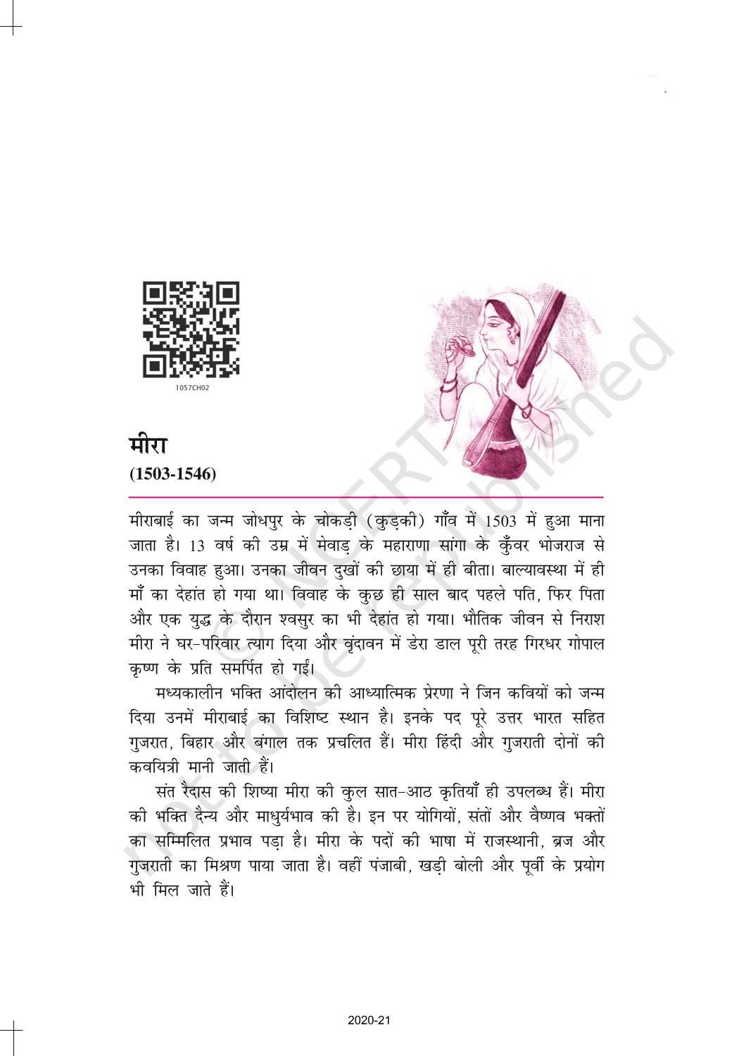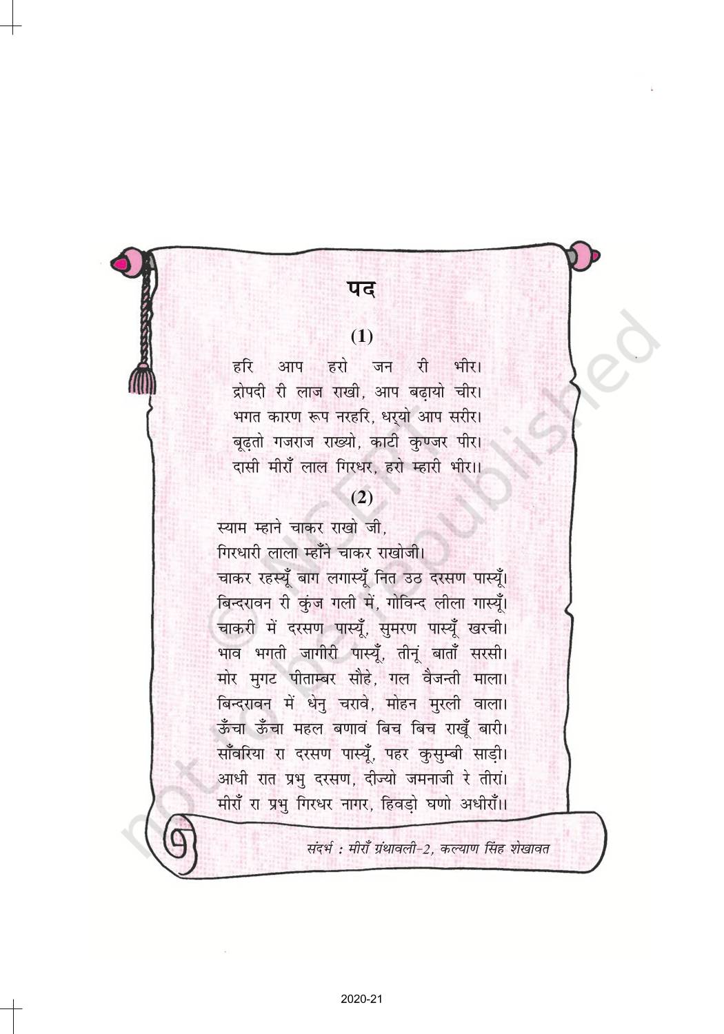 The time when students had limited options of choice for NCERT books wherein they need to go to the bookstore to buy the books but here at BeTrained.in, you can read the complete chapter-Meera Padd of NCERT books for class 10 Hindi Sparsh Part 2. If CBSE class 10 students are finding it hard to search for NCERT Hindi Sparsh Part 2 books online, then this is the right place as we have provided the textbooks of NCERT chapter wise. These books are available on our website for free along with NCERT Solutions and Exemplar solutions.