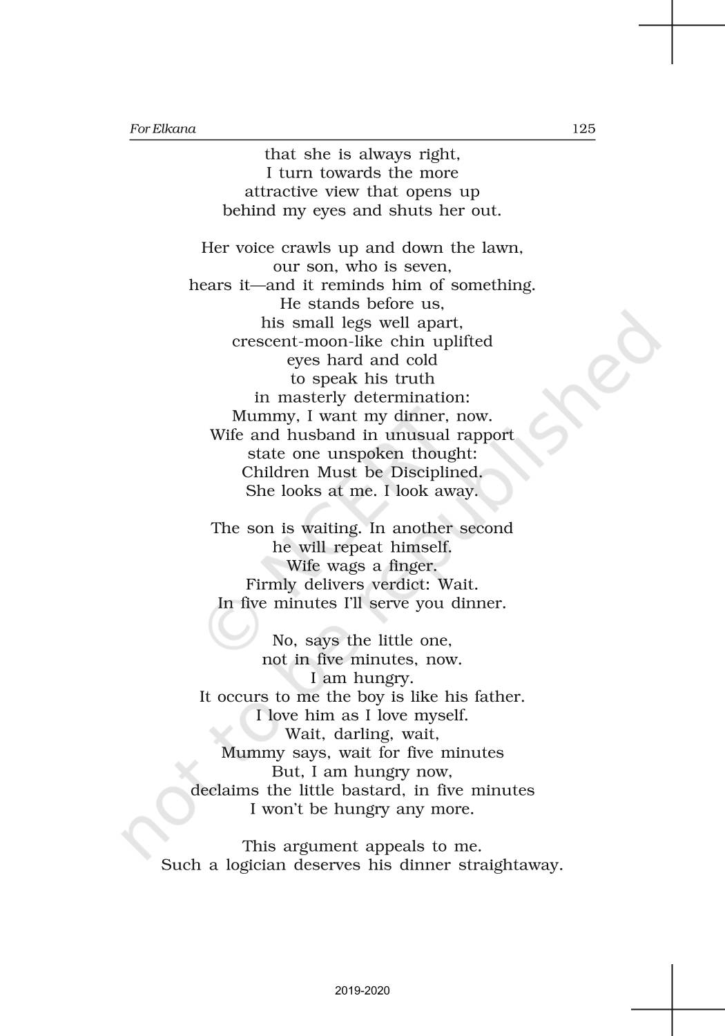 The time when students had limited options of choice for NCERT books wherein they need to go to the bookstore to buy the books but here at BeTrained.in, you can read the complete chapter-Poetry 8 For Elkana of NCERT books for class 11 English Woven Words. If CBSE class 11 students are finding it hard to search for NCERT English Woven Words books online, then this is the right place as we have provided the textbooks of NCERT chapter wise. These books are available on our website for free along with NCERT Solutions and Exemplar solutions.