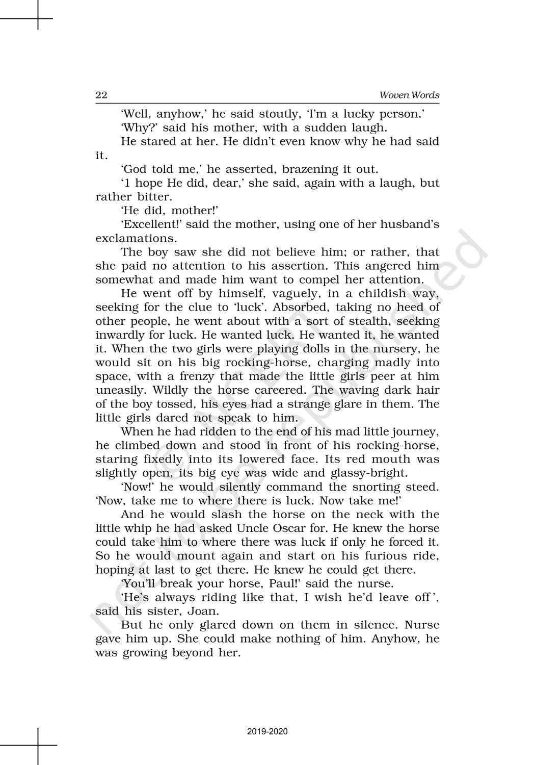 The time when students had limited options of choice for NCERT books wherein they need to go to the bookstore to buy the books but here at BeTrained.in, you can read the complete chapter-Short Stories 3 The Rocking Horse Winner of NCERT books for class 11 English Woven Words. If CBSE class 11 students are finding it hard to search for NCERT English Woven Words books online, then this is the right place as we have provided the textbooks of NCERT chapter wise. These books are available on our website for free along with NCERT Solutions and Exemplar solutions.