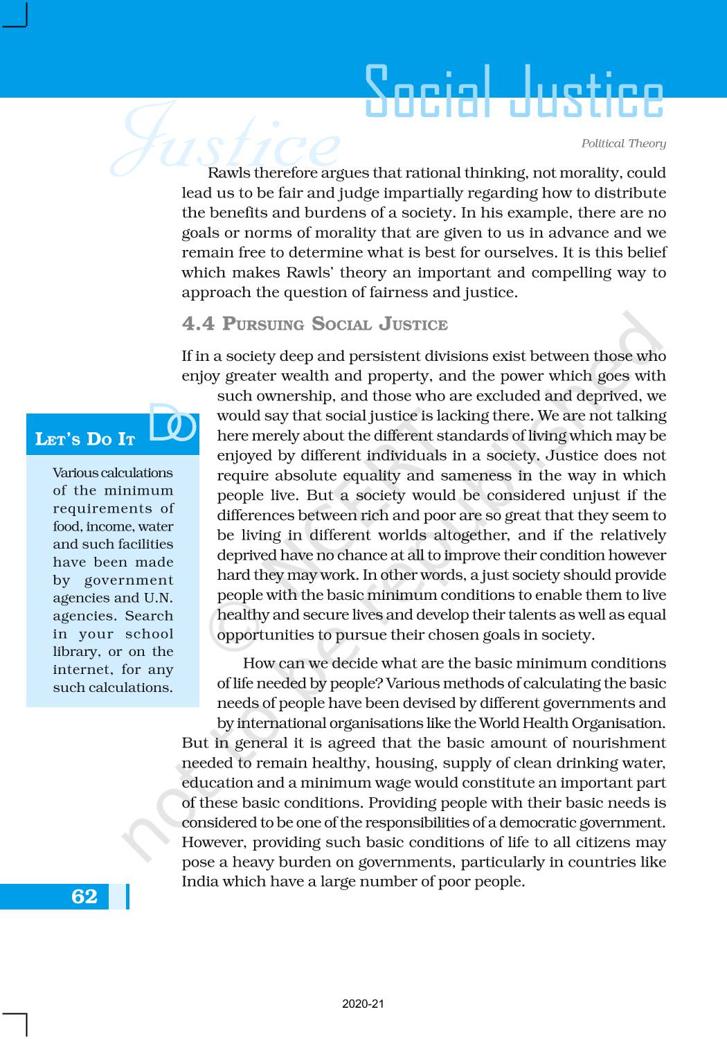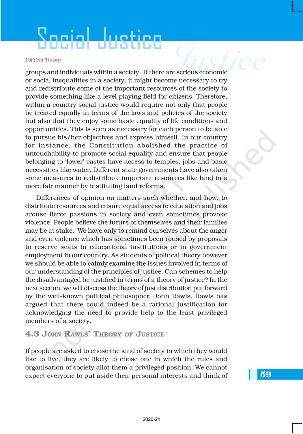 The time when students had limited options of choice for NCERT books wherein they need to go to the bookstore to buy the books but here at BeTrained.in, you can read the complete chapter-Social Justice of NCERT books for class 11 Political Theory. If CBSE class 11 students are finding it hard to search for NCERT Political Theory books online, then this is the right place as we have provided the textbooks of NCERT chapter wise. These books are available on our website for free along with NCERT Solutions and Exemplar solutions.