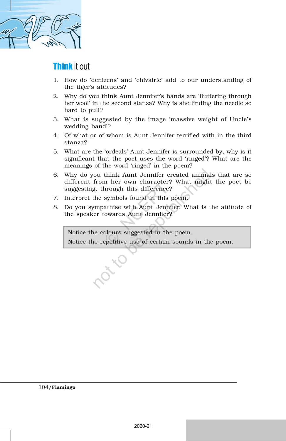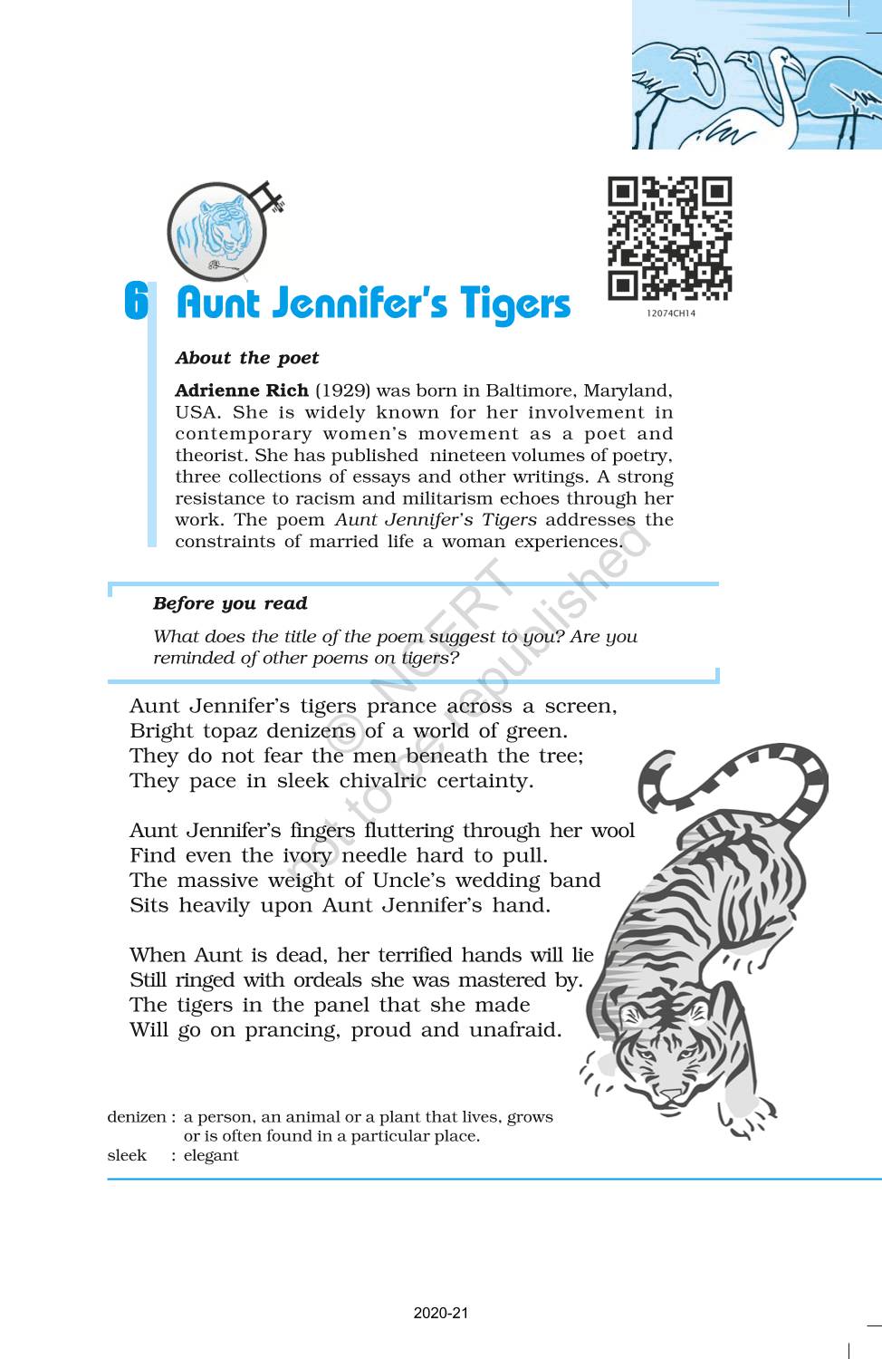 The time when students had limited options of choice for NCERT books wherein they need to go to the bookstore to buy the books but here at BeTrained.in, you can read the complete chapter-Poetry 6 Aunt Jennifers Tigers of NCERT books for class 12 Flamingo. If CBSE class 12 students are finding it hard to search for NCERT Flamingo books online, then this is the right place as we have provided the textbooks of NCERT chapter wise. These books are available on our website for free along with NCERT Solutions and Exemplar solutions.