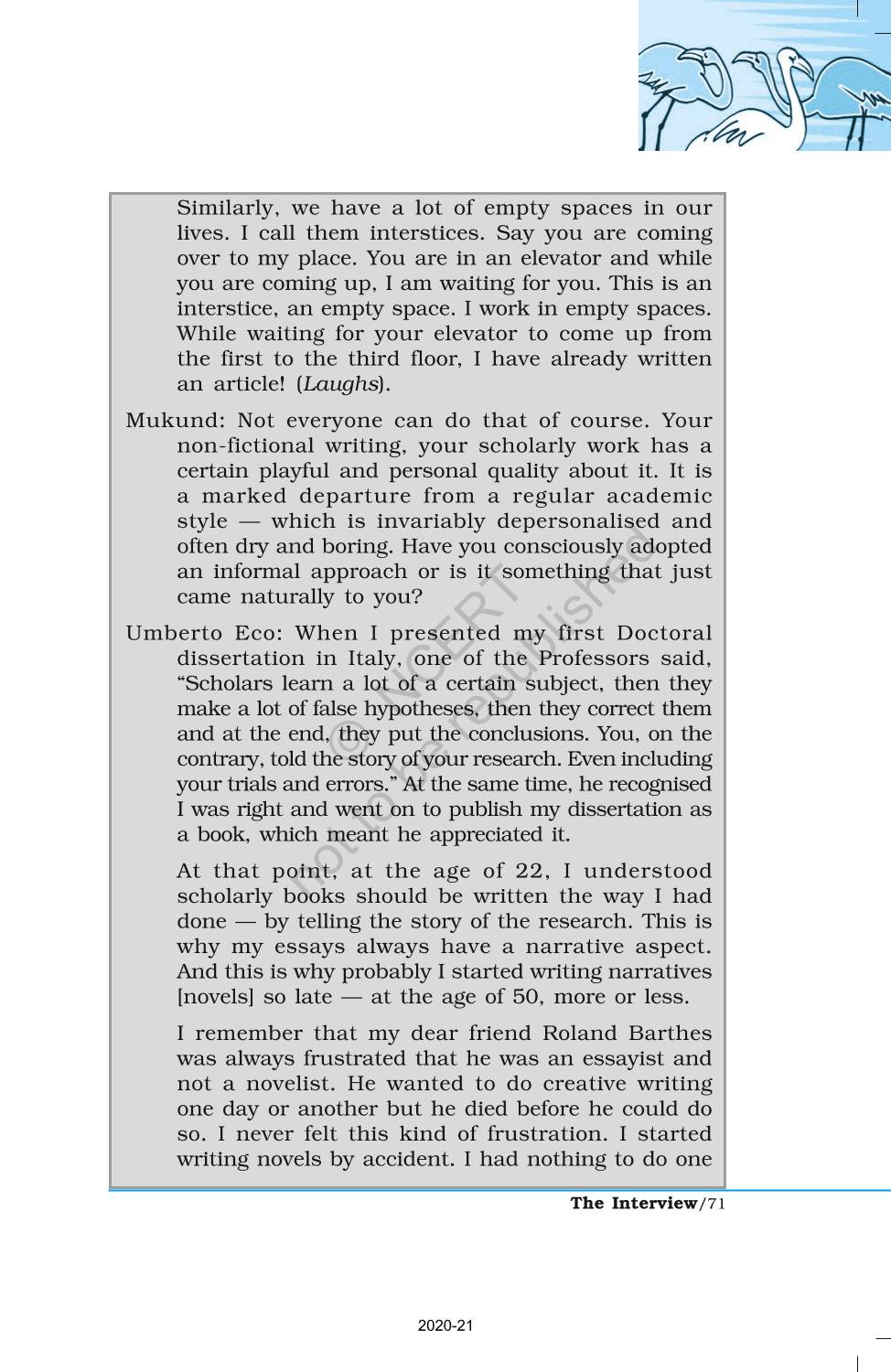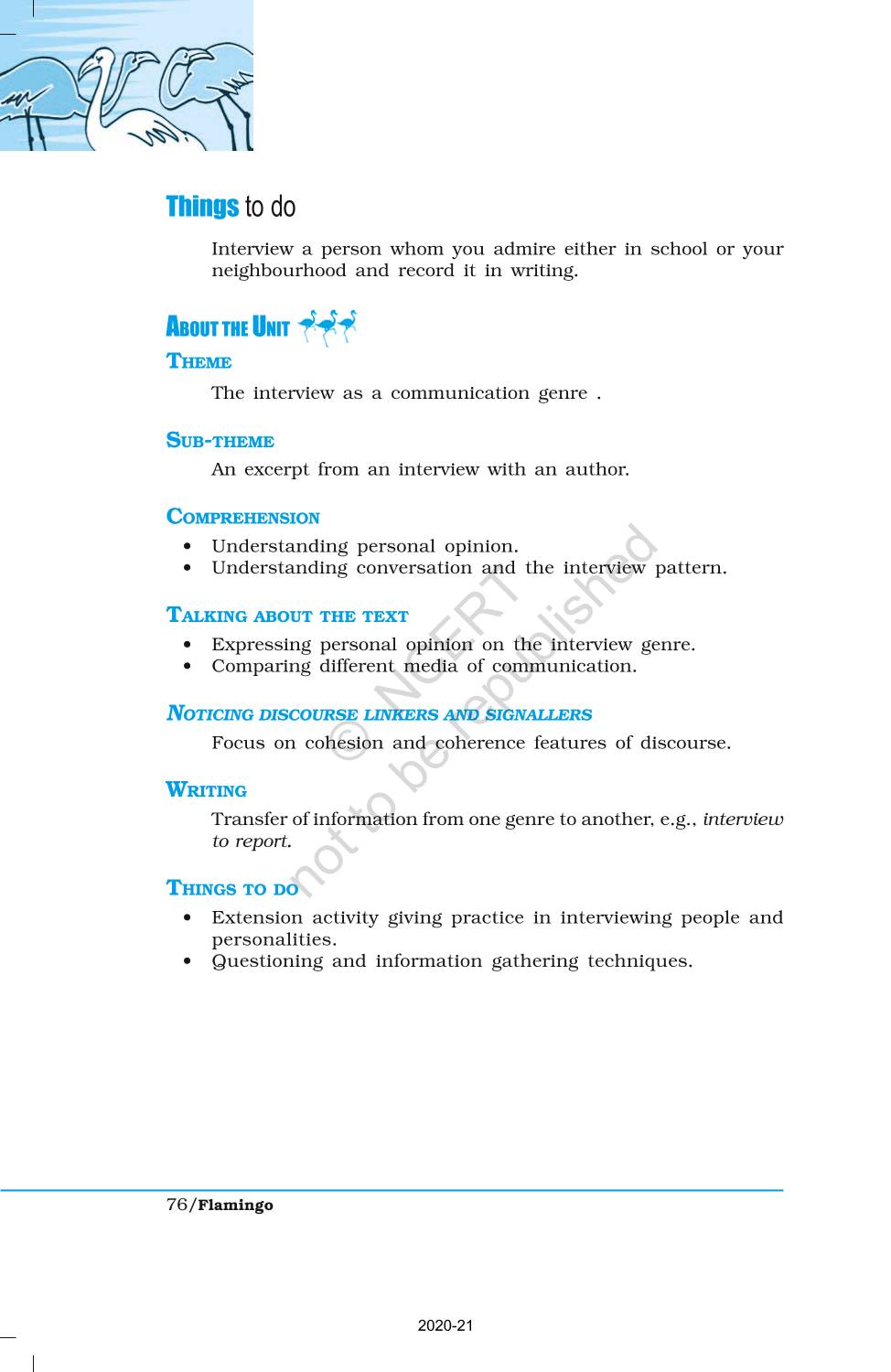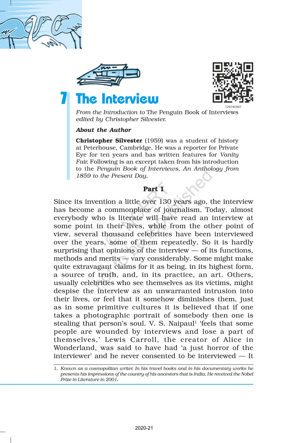 The time when students had limited options of choice for NCERT books wherein they need to go to the bookstore to buy the books but here at BeTrained.in, you can read the complete chapter-Prose 7 The Interview of NCERT books for class 12 Flamingo. If CBSE class 12 students are finding it hard to search for NCERT Flamingo books online, then this is the right place as we have provided the textbooks of NCERT chapter wise. These books are available on our website for free along with NCERT Solutions and Exemplar solutions.