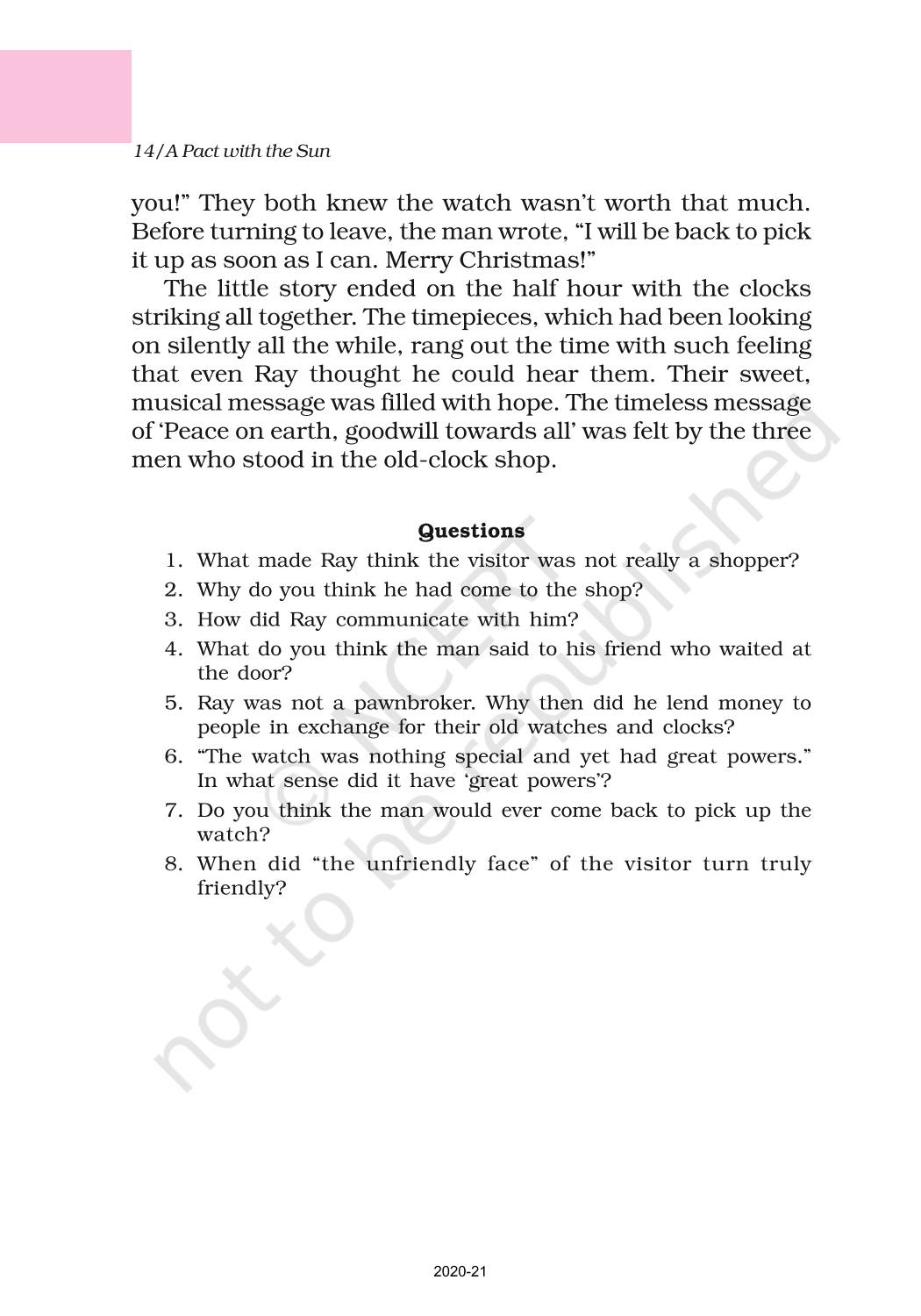 The time when students had limited options of choice for NCERT books wherein they need to go to the bookstore to buy the books but here at BeTrained.in, you can read the complete chapter-The Old Clock Shop of NCERT books for class 6 English A Pact With The Sun. If CBSE class 6 students are finding it hard to search for NCERT English A Pact With The Sun books online, then this is the right place as we have provided the textbooks of NCERT chapter wise. These books are available on our website for free along with NCERT Solutions and Exemplar solutions.