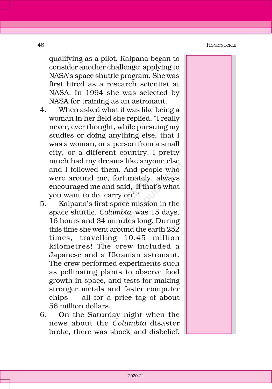 The time when students had limited options of choice for NCERT books wherein they need to go to the bookstore to buy the books but here at BeTrained.in, you can read the complete chapter-An Indian American Woman In Space Kalpana Chawla of NCERT books for class 6 English Honeysuckle. If CBSE class 6 students are finding it hard to search for NCERT English Honeysuckle books online, then this is the right place as we have provided the textbooks of NCERT chapter wise. These books are available on our website for free along with NCERT Solutions and Exemplar solutions.