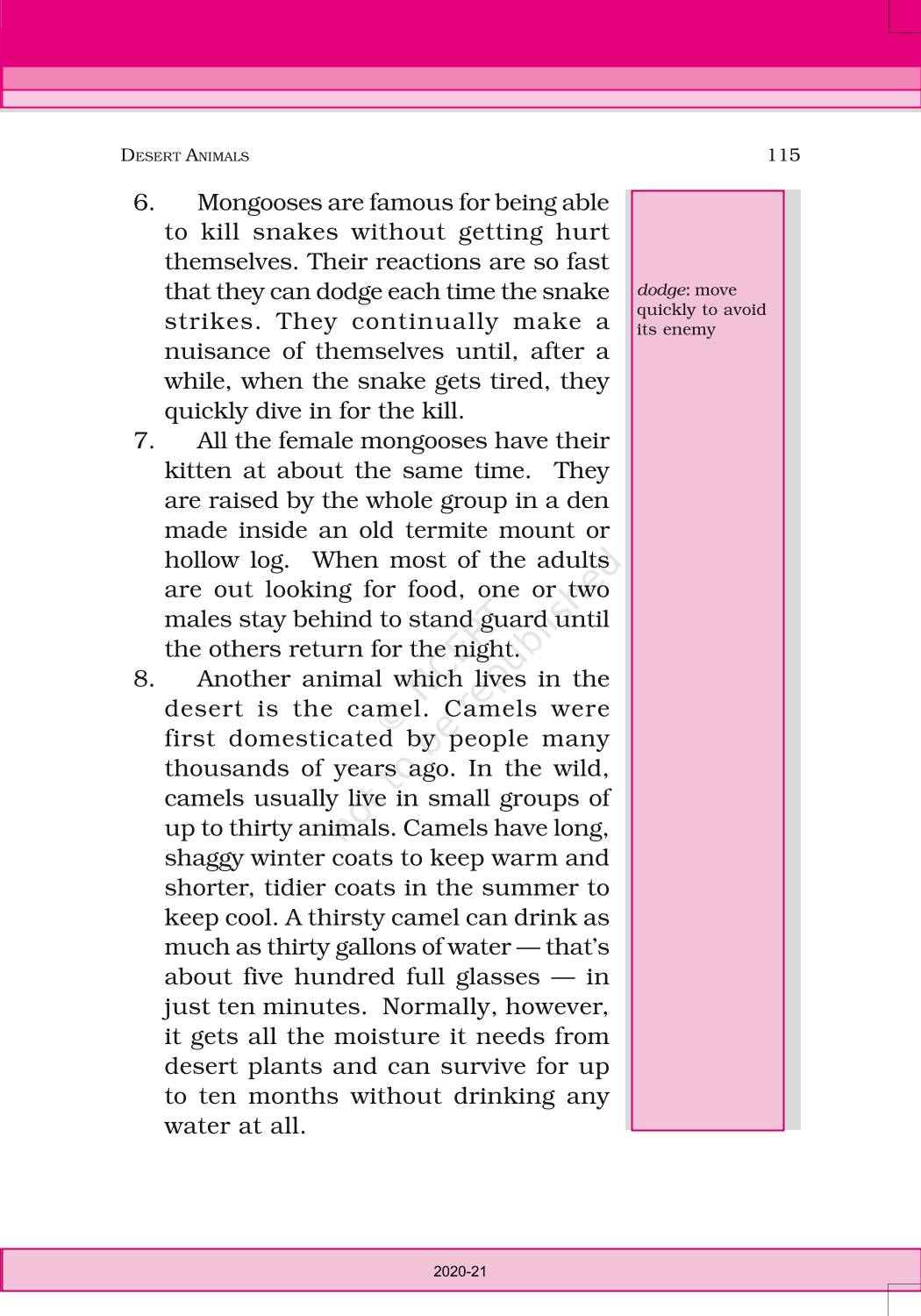The time when students had limited options of choice for NCERT books wherein they need to go to the bookstore to buy the books but here at BeTrained.in, you can read the complete chapter-Desert Animals of NCERT books for class 6 English Honeysuckle. If CBSE class 6 students are finding it hard to search for NCERT English Honeysuckle books online, then this is the right place as we have provided the textbooks of NCERT chapter wise. These books are available on our website for free along with NCERT Solutions and Exemplar solutions.