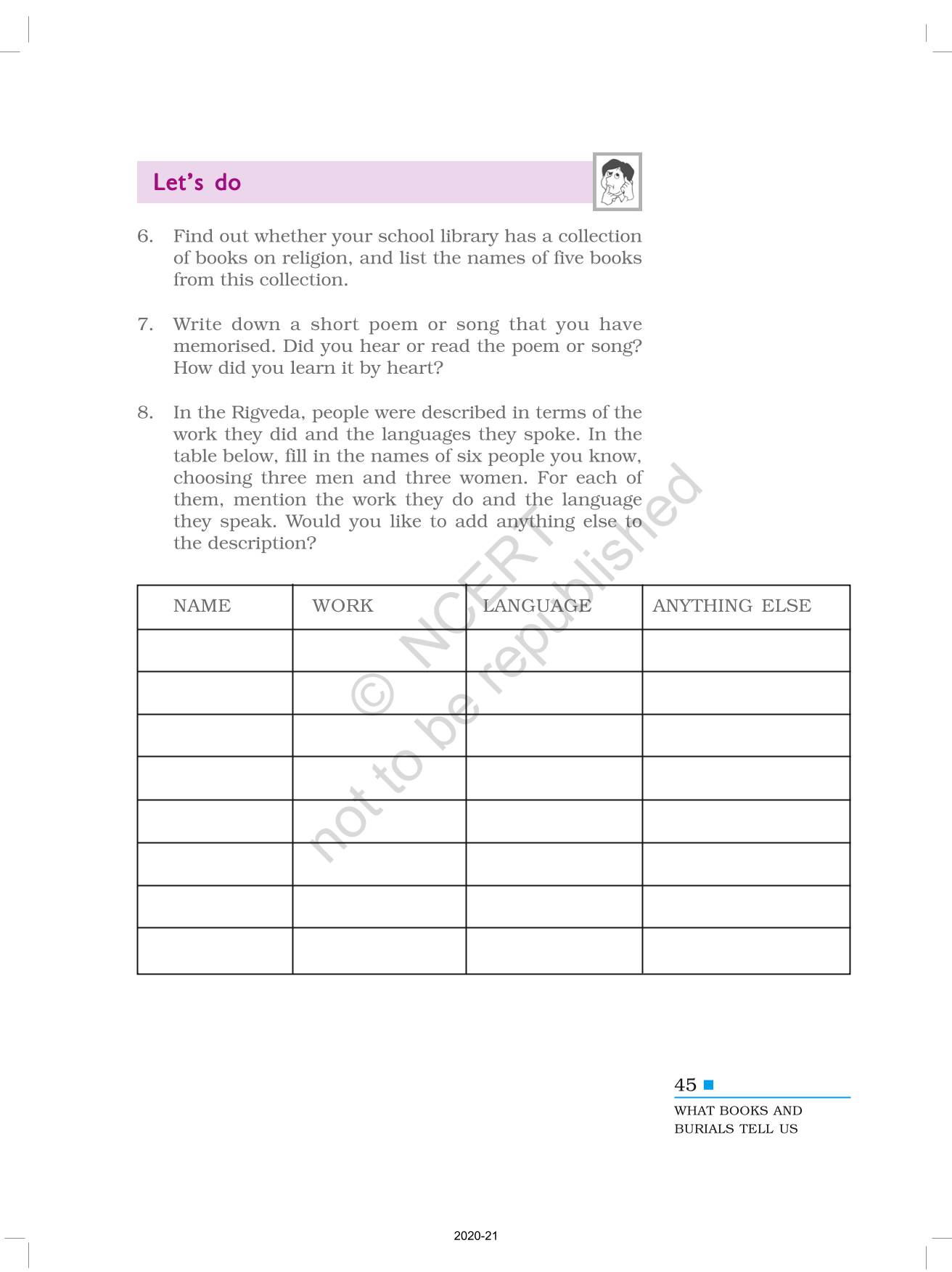 The time when students had limited options of choice for NCERT books wherein they need to go to the bookstore to buy the books but here at BeTrained.in, you can read the complete chapter-What Books And Burials Tell Us of NCERT books for class 6 History Our Pasts I. If CBSE class 6 students are finding it hard to search for NCERT History Our Pasts I books online, then this is the right place as we have provided the textbooks of NCERT chapter wise. These books are available on our website for free along with NCERT Solutions and Exemplar solutions.