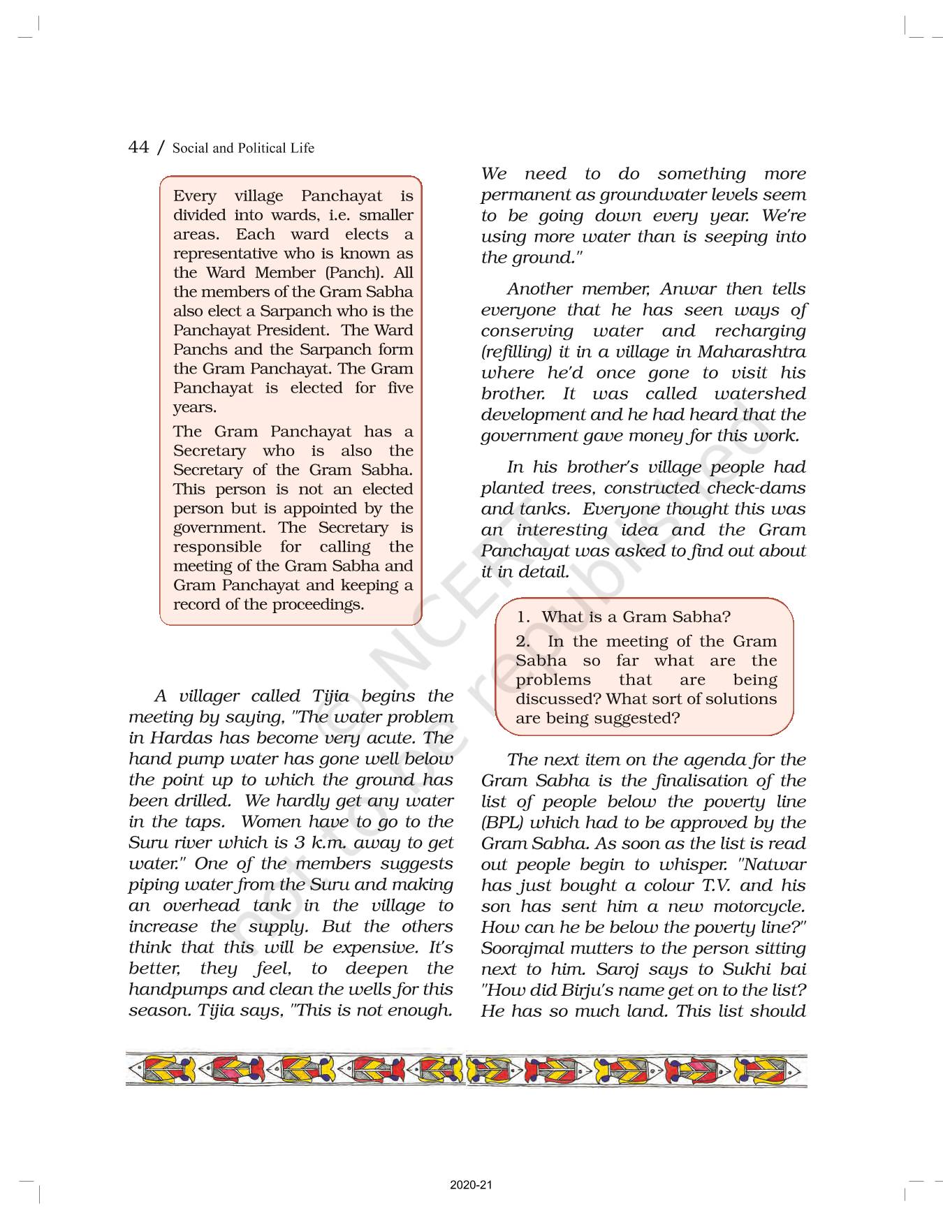 The time when students had limited options of choice for NCERT books wherein they need to go to the bookstore to buy the books but here at BeTrained.in, you can read the complete chapter-Panchayati Raj of NCERT books for class 6 Political Science Social And Political Life I. If CBSE class 6 students are finding it hard to search for NCERT Political Science Social And Political Life I books online, then this is the right place as we have provided the textbooks of NCERT chapter wise. These books are available on our website for free along with NCERT Solutions and Exemplar solutions.
