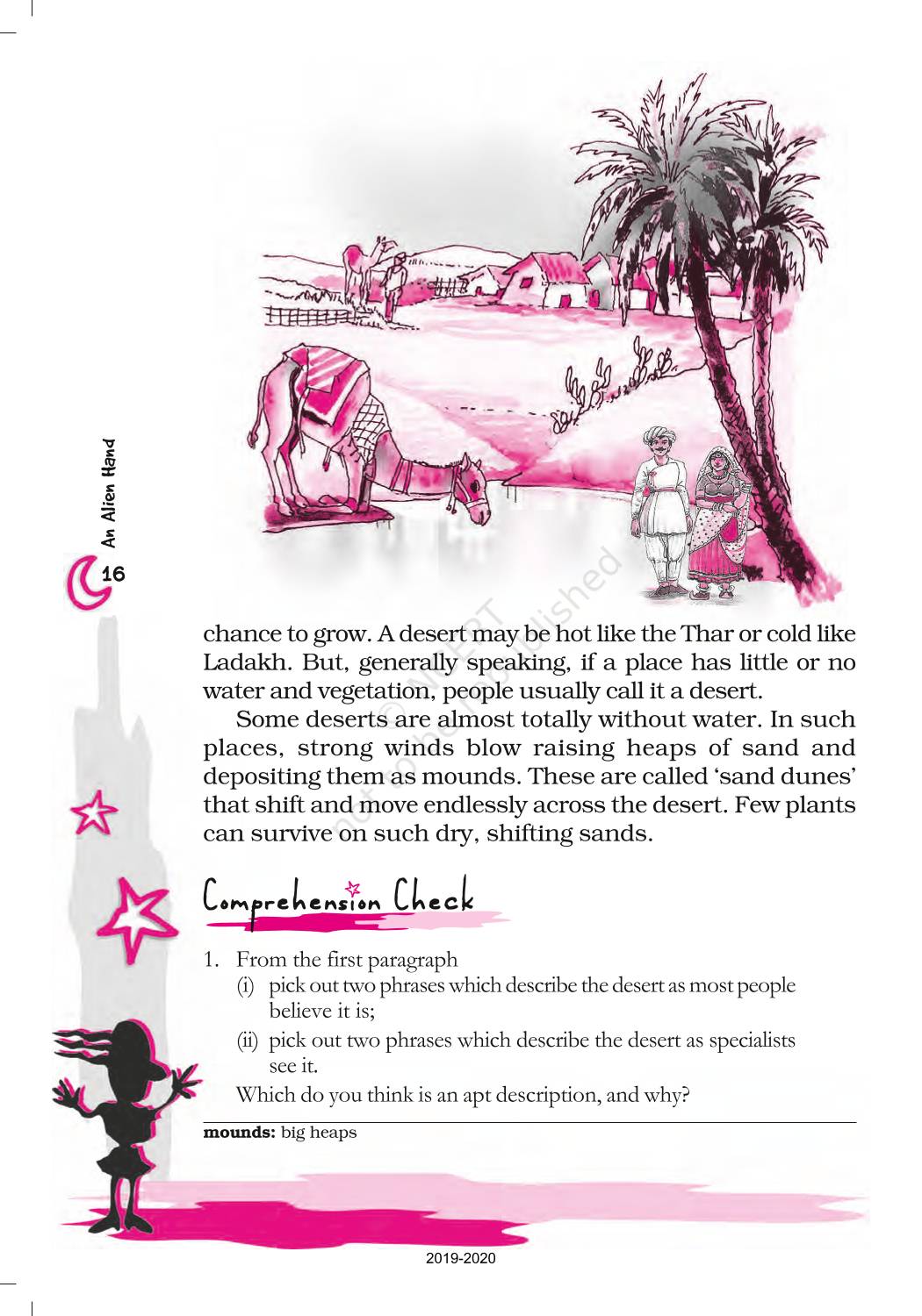 The time when students had limited options of choice for NCERT books wherein they need to go to the bookstore to buy the books but here at BeTrained.in, you can read the complete chapter-The Desert of NCERT books for class 7 English An Alien Hand. If CBSE class 7 students are finding it hard to search for NCERT English An Alien Hand books online, then this is the right place as we have provided the textbooks of NCERT chapter wise. These books are available on our website for free along with NCERT Solutions and Exemplar solutions.
