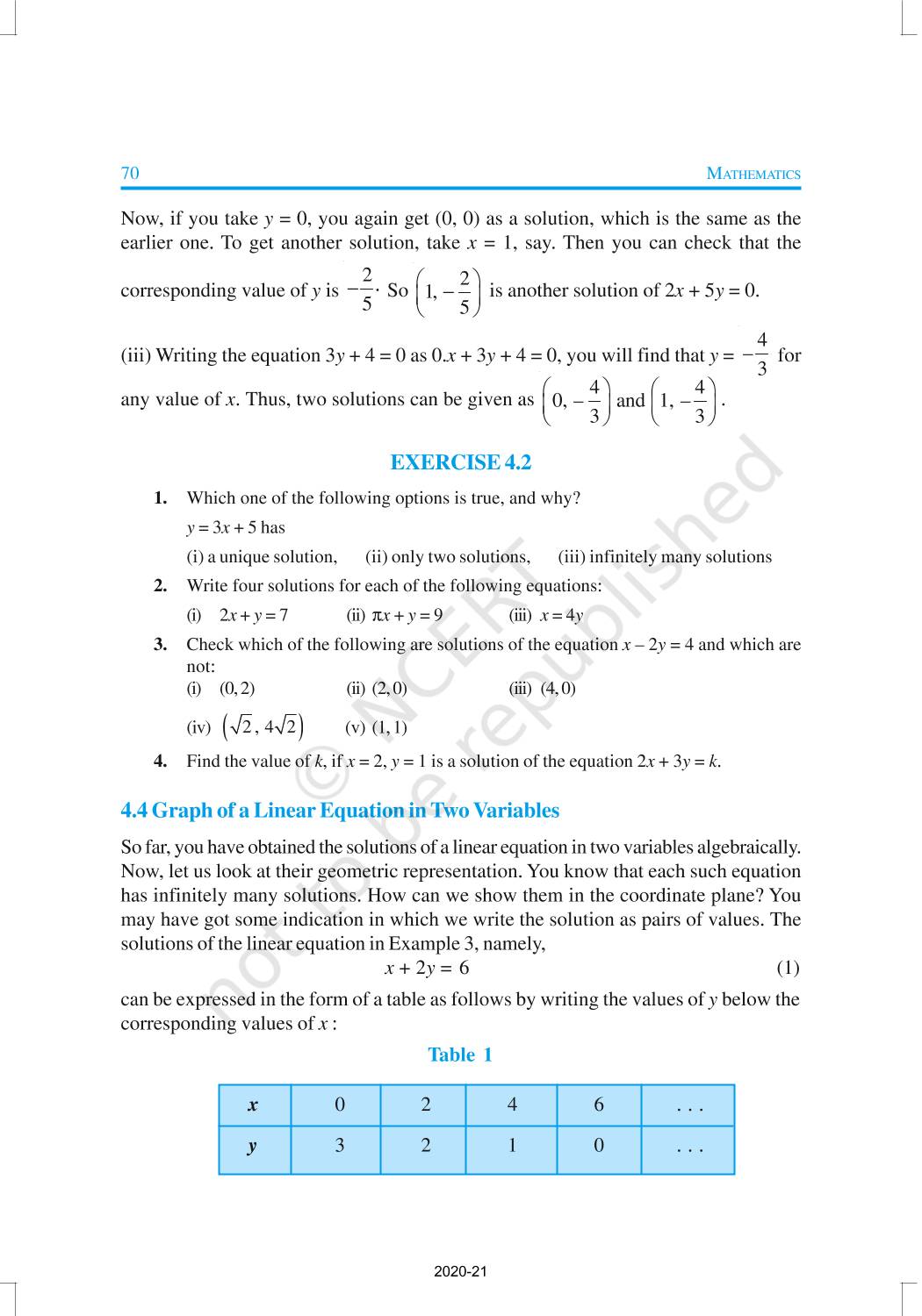 In earlier classes, you have studied linear equations in one variable.You know that Linear equations have a unique (i.e., one and only one) solution. You may also remember how to represent the solution on a number line. In this chapter, the knowledge of linear equations in one variable shall be recalled and extended to that of two variables. You will be considering questions like: Does a linear equation in two variables have a solution? If yes, is it unique? What does the solution look like on the Cartesian plane? You shall also use the concepts you studied in Chapter 3 to answer these questions.